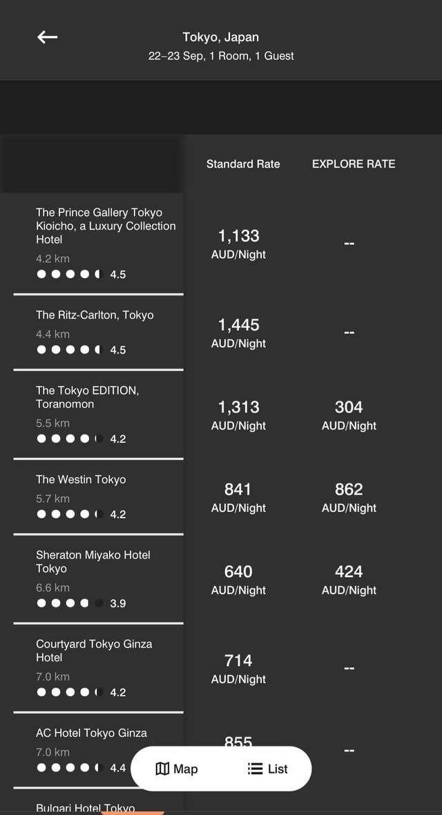 On iOS, on the "Book" tab, once you searched for a city there was a button next to Map in the list that said Grid. You could use this to easily compare different rates (e.g. Flexible, AAA, points, etc).