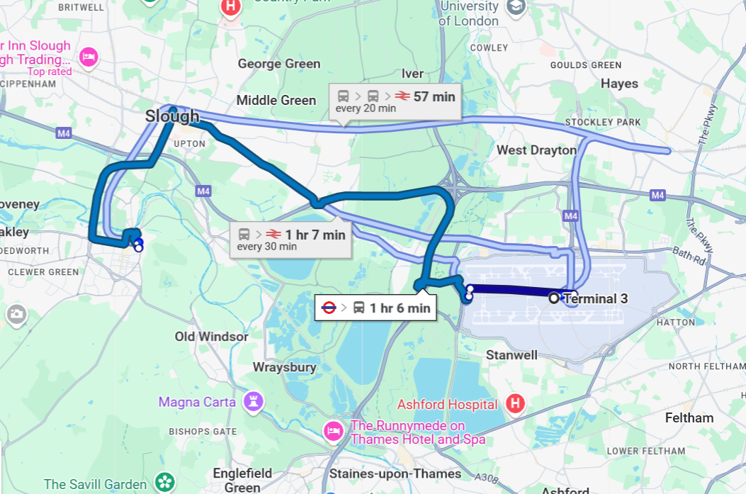Central London is further away but somewhat better connected so can also be reached in about an hour by public transport. (Much more expensive by Taxi)
