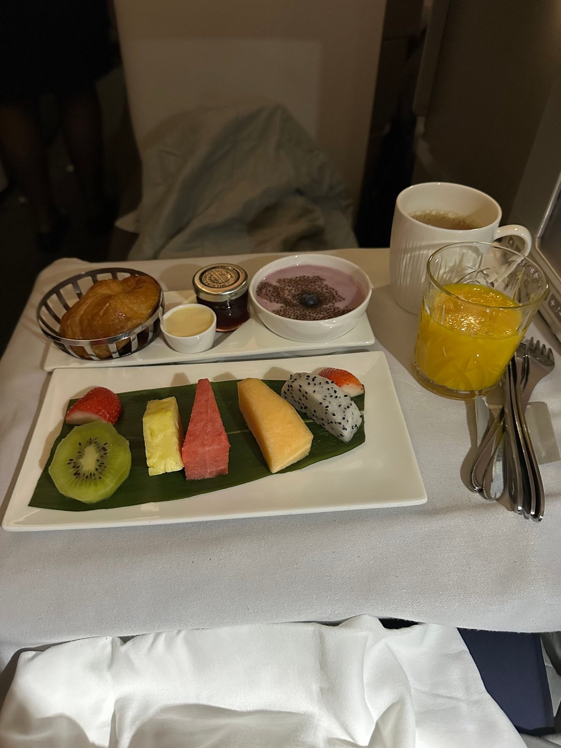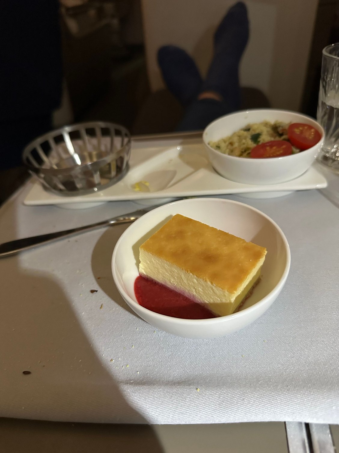 The 787-9 was downgauged to a 787-8 so along with plenty of folk on the flight in 3 cabins I had an involuntary downgrade - in my case from F to J. The J experience was better than I’d feared - very good crew and even though it was old CW seating I had a pretty good sleep on the 14+ hour flight. I’d eaten prior in the outstanding CX Pier First lounge but enjoyed what I had on board with the exception of the cheesecake which wasn’t great.