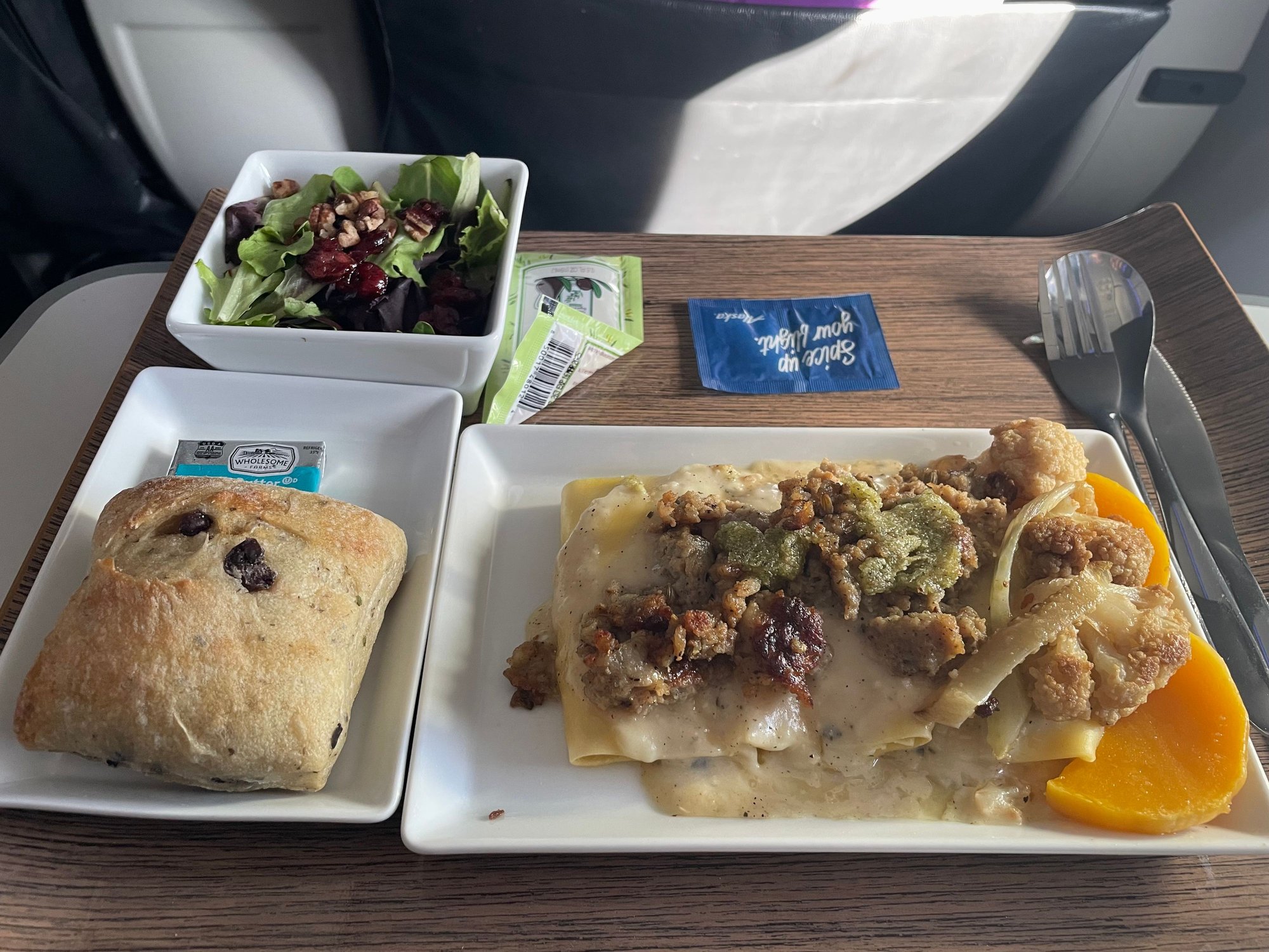 Butternut squash filled manicotti pasta, topped with a sage pecorino cream sauce, roasted cauliflower, Italian sausage, and a hazelnut pesto
