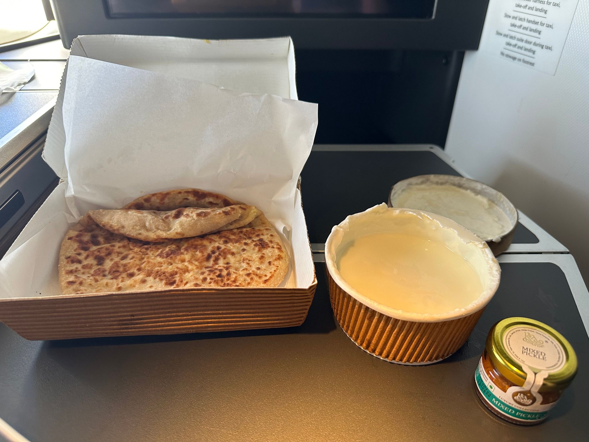 I am not a huge fan of breakfasts on a plane but this wasn’t bad. I was however glad of the paneer parathas and yoghurt acquired from the hotel before setting off to the airport as I was absolutely starving. I don’t think it’s reasonable to expect people to have a proper breakfast in the airport lounge in the early hours of the morning. I’ll submit the rest once I receive it…. Currently sat over the Middle East at 36,000ft