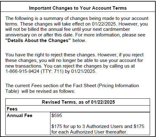 I just received notification on my latest statement that my annual fee will be increasing in 2025, albeit not until June when my card member anniversary date hits. I found the notice (see below) a bit interesting, as it allows you to reject the changes. If I do, I won't be able to make "new transactions" on my account. But I wonder, could I (and my AUs) still access the Admirals Club? And would my AF stay at the old rate? I can't image this would work, but I figure it couldn't hurt to ask if anyone's tried anything similar.