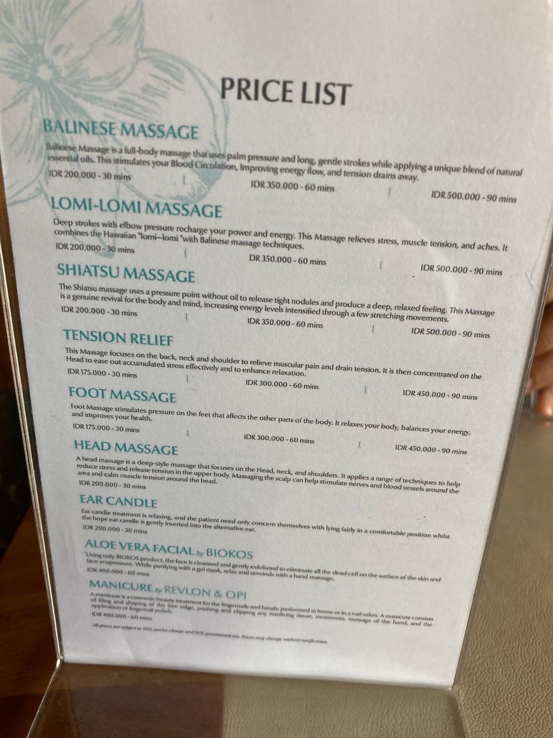 The hotel has no designated spa, yet one can book via receptions for inroom treatments.