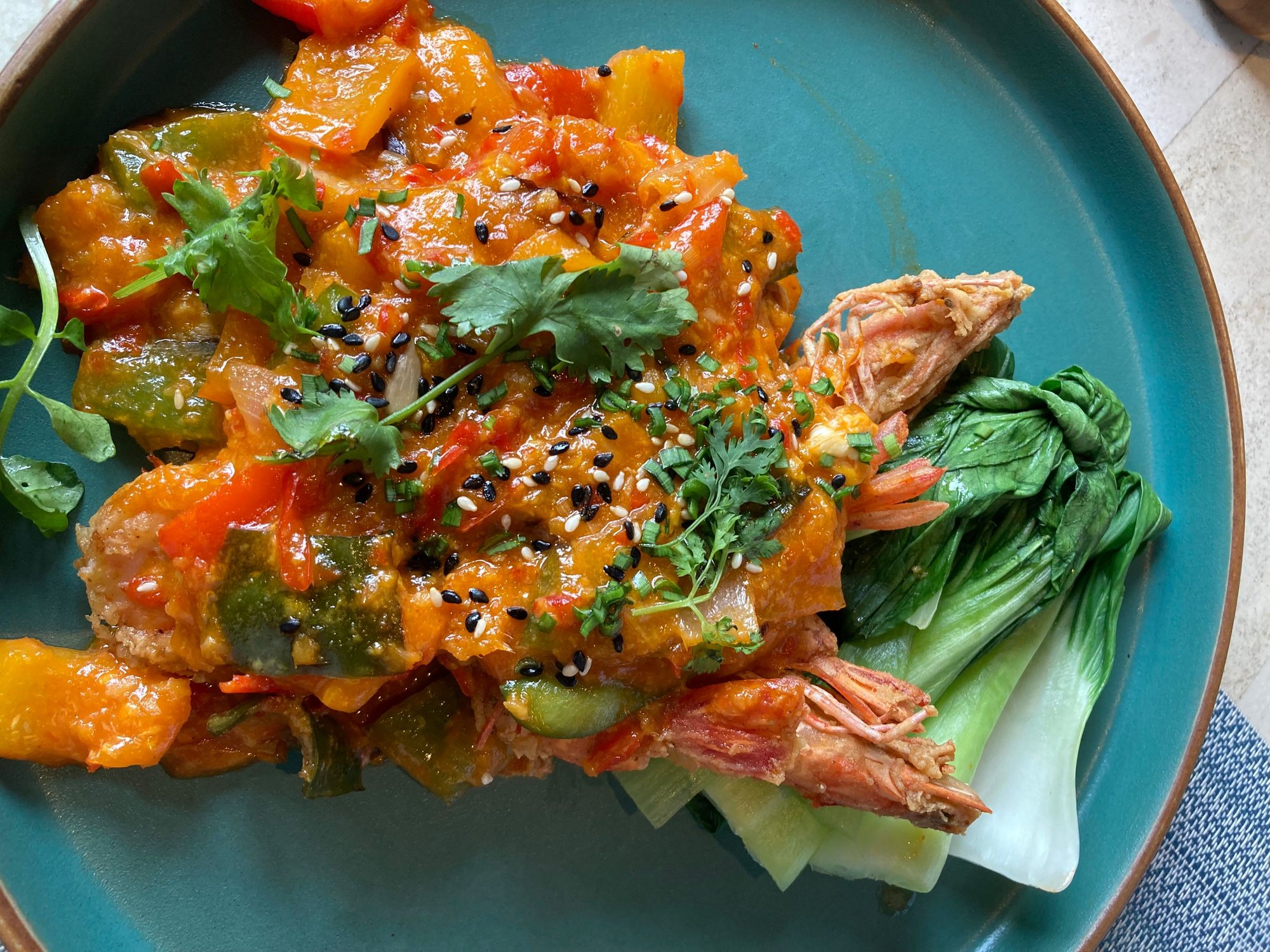 Wok fried prawns with Singaporean chili sauce, egg, capsicum, bok choy
