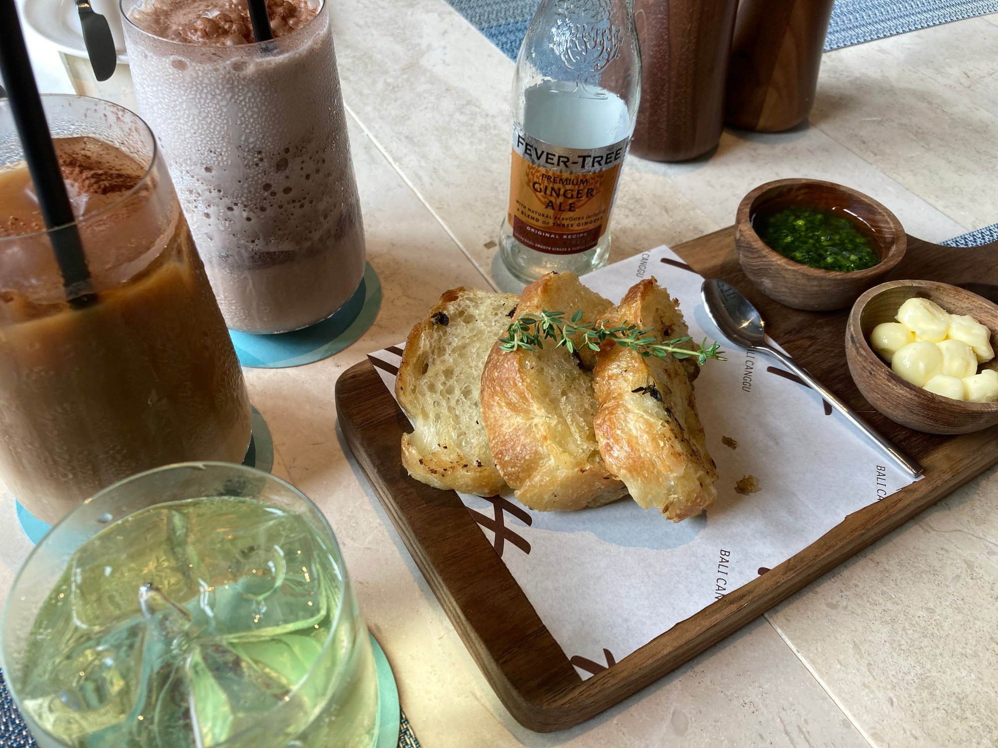 Drinks and complimentary warm bread.
