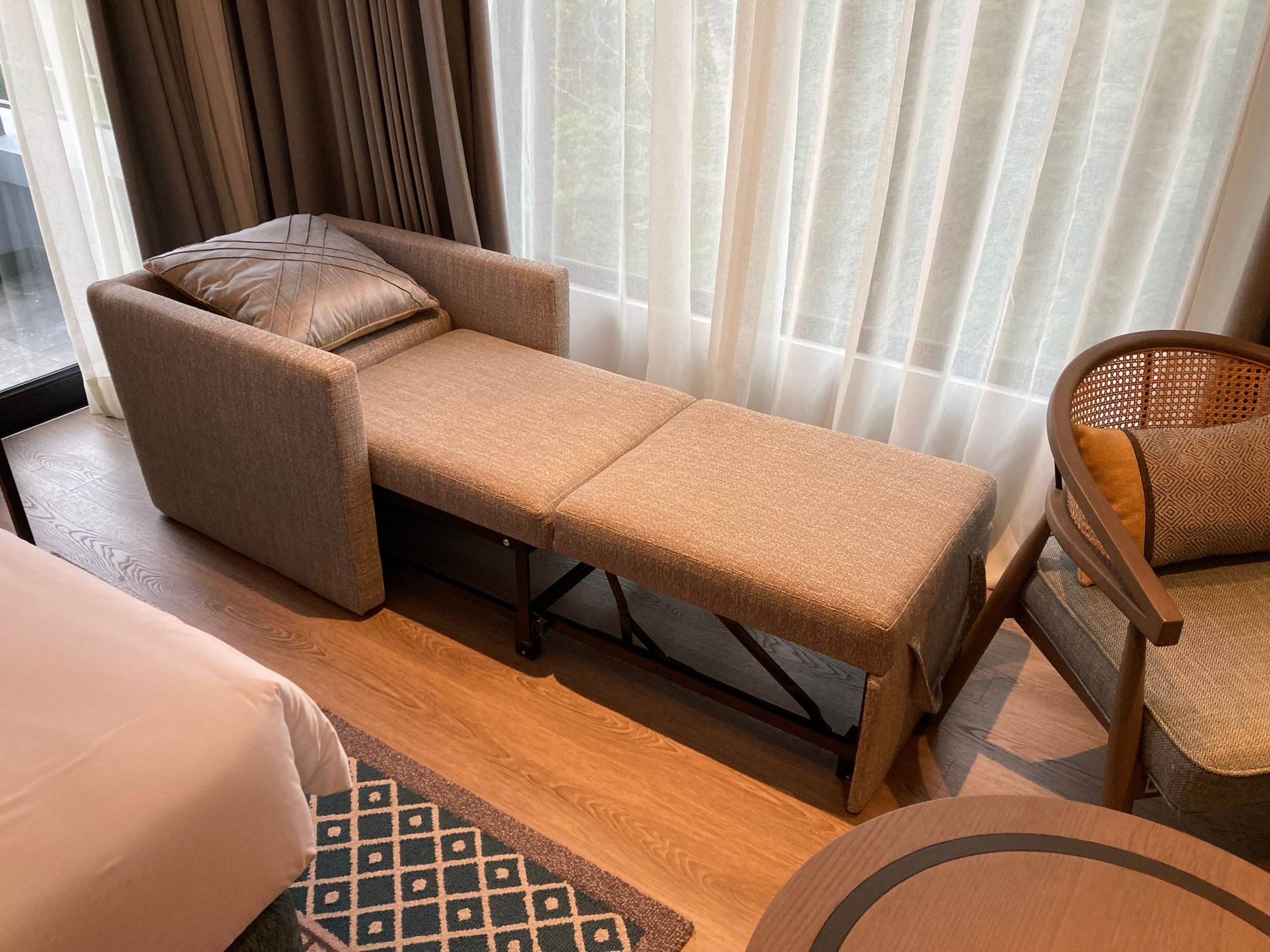 the seat in the room can be transformed into a sleeping surface for a child, maid or extra person.