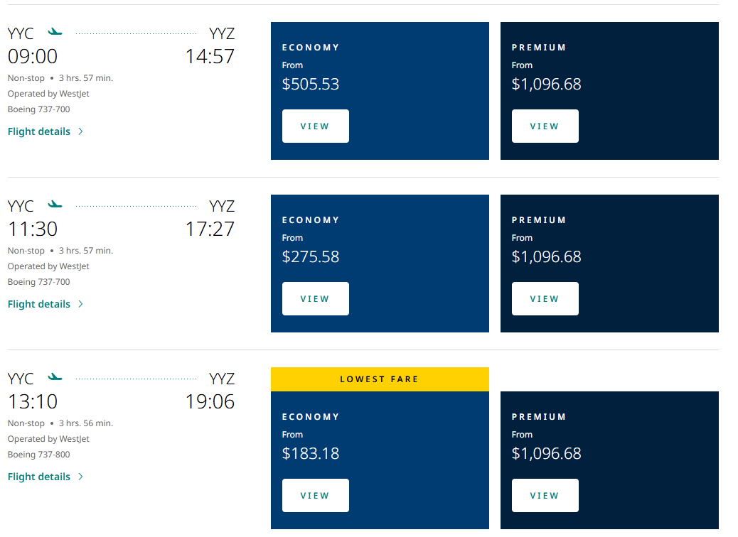 I took a random (really!) date - Tuesday Feb 18 - and compared AC, PD and WS on a one-way segment from YYC - YYZ ... a route where all three airlines offer non-stop service. (The date just happened to be the one that showed up when I hopped on to WestJet's site, probably based on a previous search ... although it wasn't for YYC-YYZ)