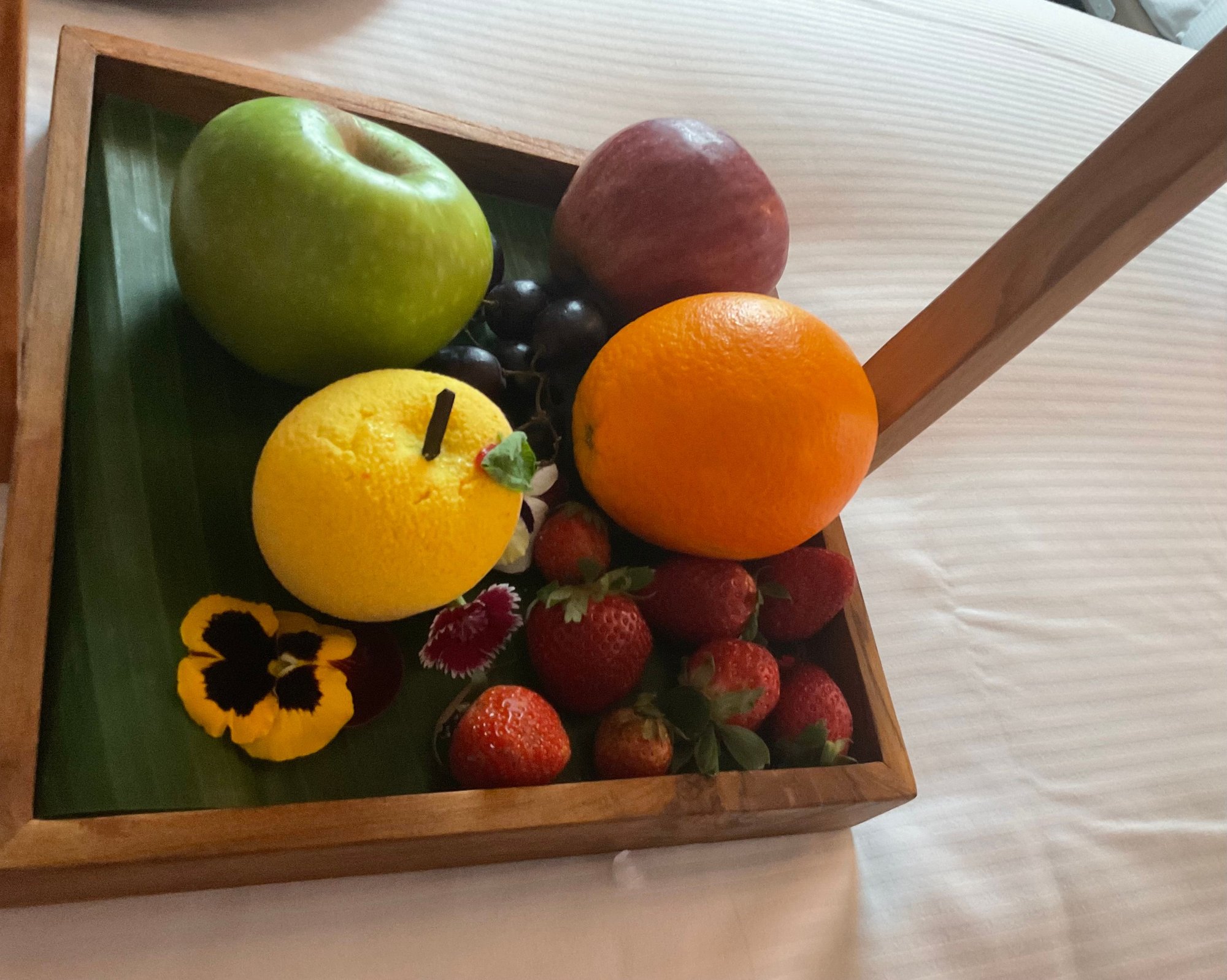Before arrival they contacted us asking about arrival time, and apologizing for no suite upgrades. It seems they only have 5 suites in 184 or so rooms. We arrived on Friday, so things were pretty busy. We got a corner room on the 15th floor. Nicely appointed, very comfortable bed and pillows. The bedroom is carpeted. They brought a nice fruit plate as a welcome amenity. My daughter was looking at it and noticed the pear had condensation on it. Strange. Upon touching it, it was actually a cleverly disguised cake, with fruit filling!