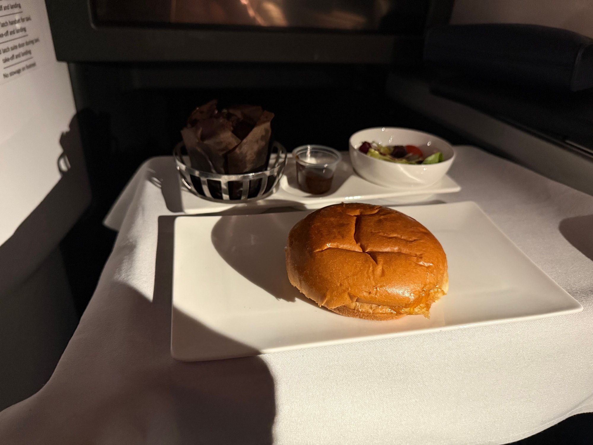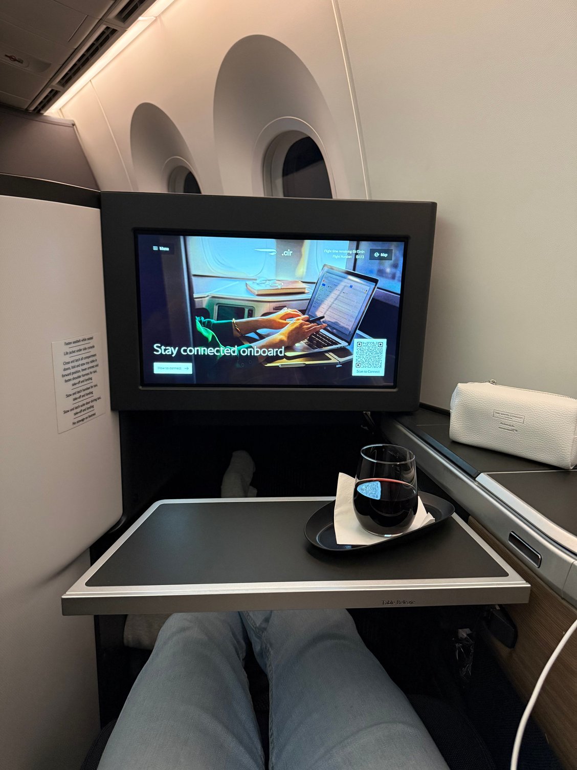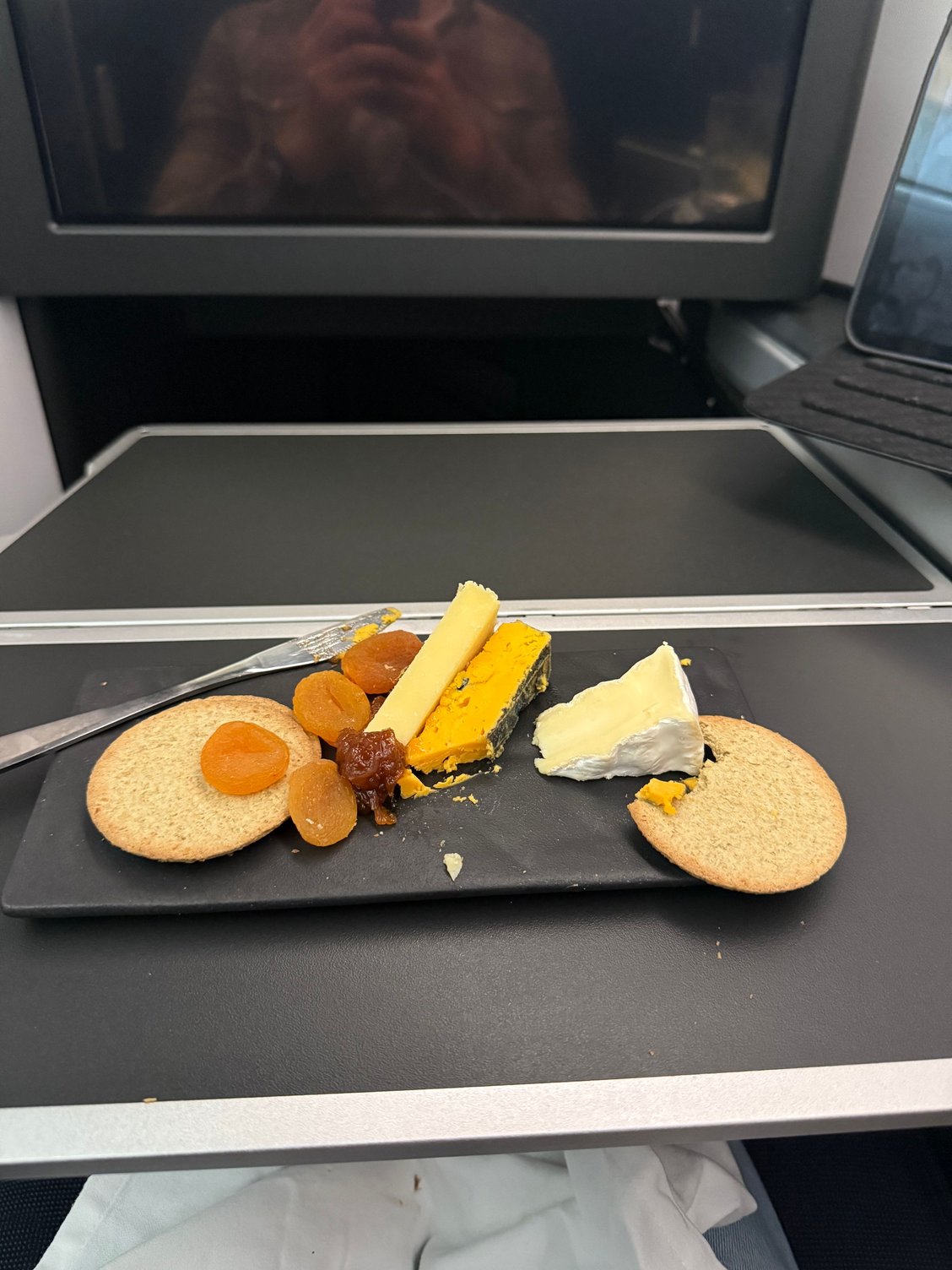 Food was tasty but service was odd - couldn’t decide if the crew were being lazy, cutting costs or trying to be efficient given the flight length. We weren’t offered a post take off drink and instead served my main meal drink of Pinot Noir with nuts and then served it again once the meal arrived. We also had to ask at least 5 times for a pre departure drink only to be finally told they had ran out but in fairness was offered champagne from the F cabin. After my dessert I asked for cheese and biscuits which too was forgotten. When I reminded the crew she tried to save face and still insisted on clearing the tray before bringing it to me which meant I was then left with the cheeseboard being directly placed on the table as per the photo! Overall very forgetful crew in general which let the flight’s service down somewhat. 7/10