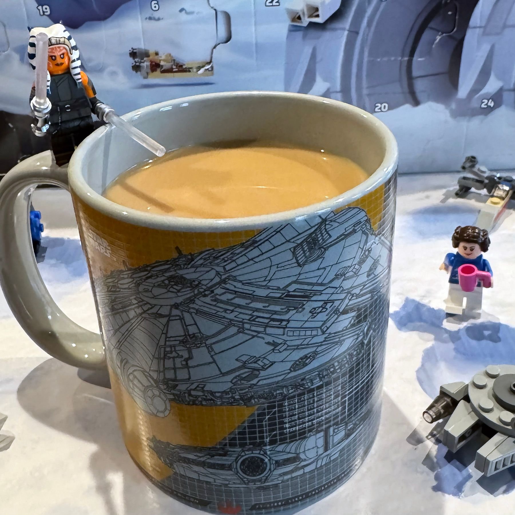 Wow! This is a great surprise. Thank you, FTSS! Already putting the Millennium Falcon coffee mug to good use this morning. As you can tell, Ahsoka Tano is guarding my caffeine with both of her lightsabers, and Princess Lea is coming over for a refill. From this year's Lego Star Wars Advent Calendar.