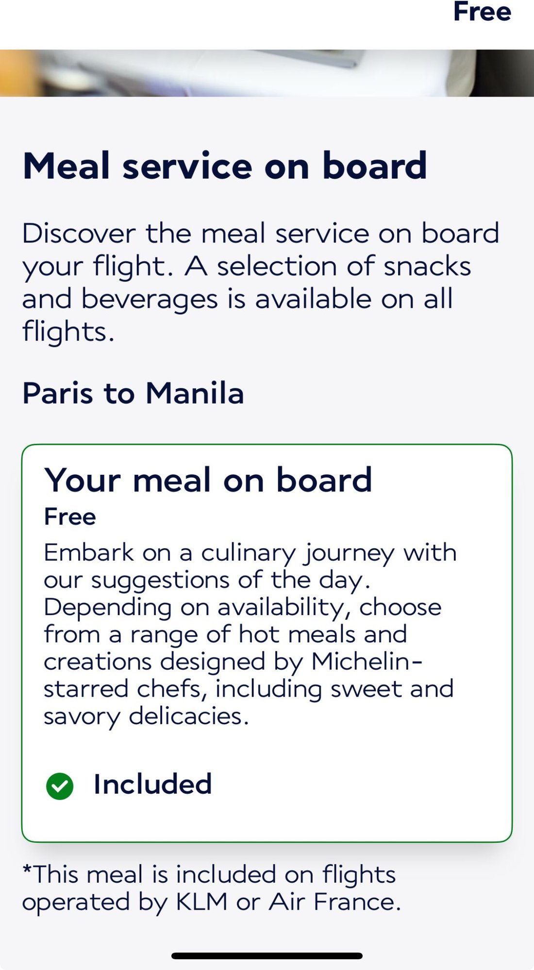 All I get is the above pic saying that I have a free meal and only the option to choose one of the special meal (eg vegan, Kosher etc)