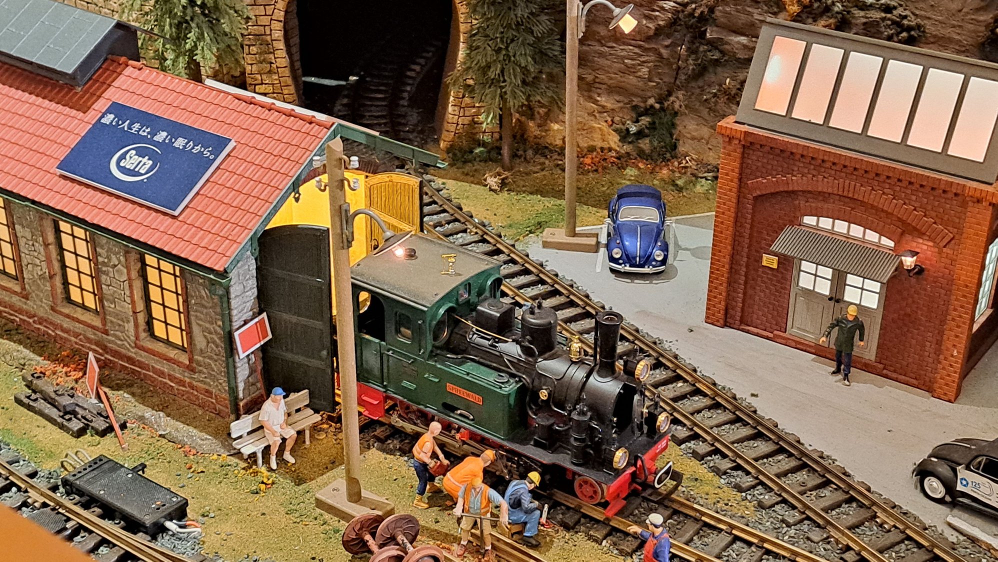 Part of the train city/ski mountain set at Hilton Hiroshima. A white led light flashed at the train wheel set to give an impression of a welding arc at work