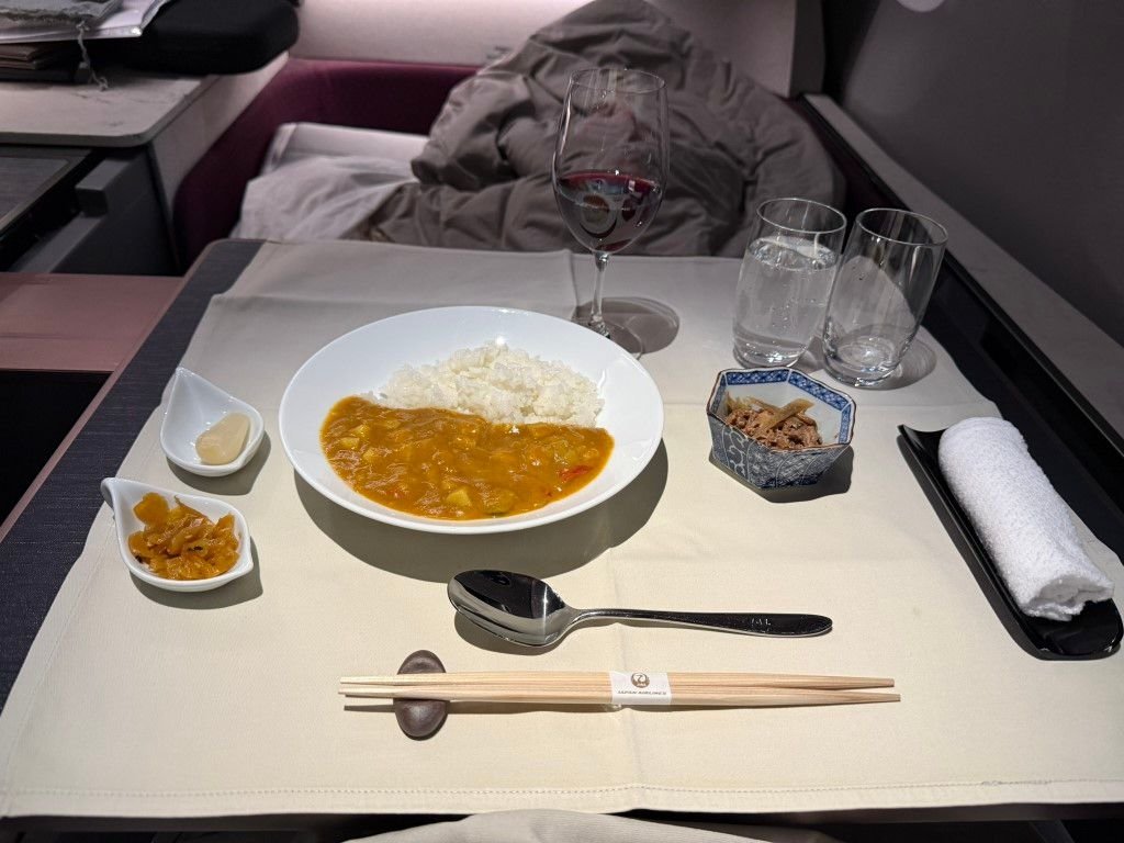 Yeah, nah. It's not terrible, but I guess anything's going to be a disappointment after you've had the legendary JAL beef curry. The small side bowl is the Yonezwagyu Shigureni snack from the ALC menu. Paired with the pinot noir.