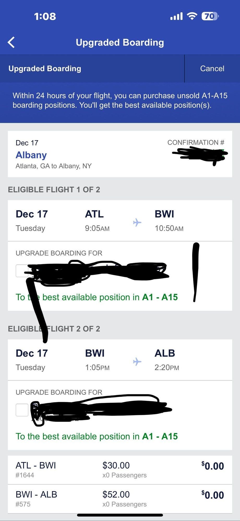 Buying "Upgraded boarding" to A1-A15 on connecting flights
