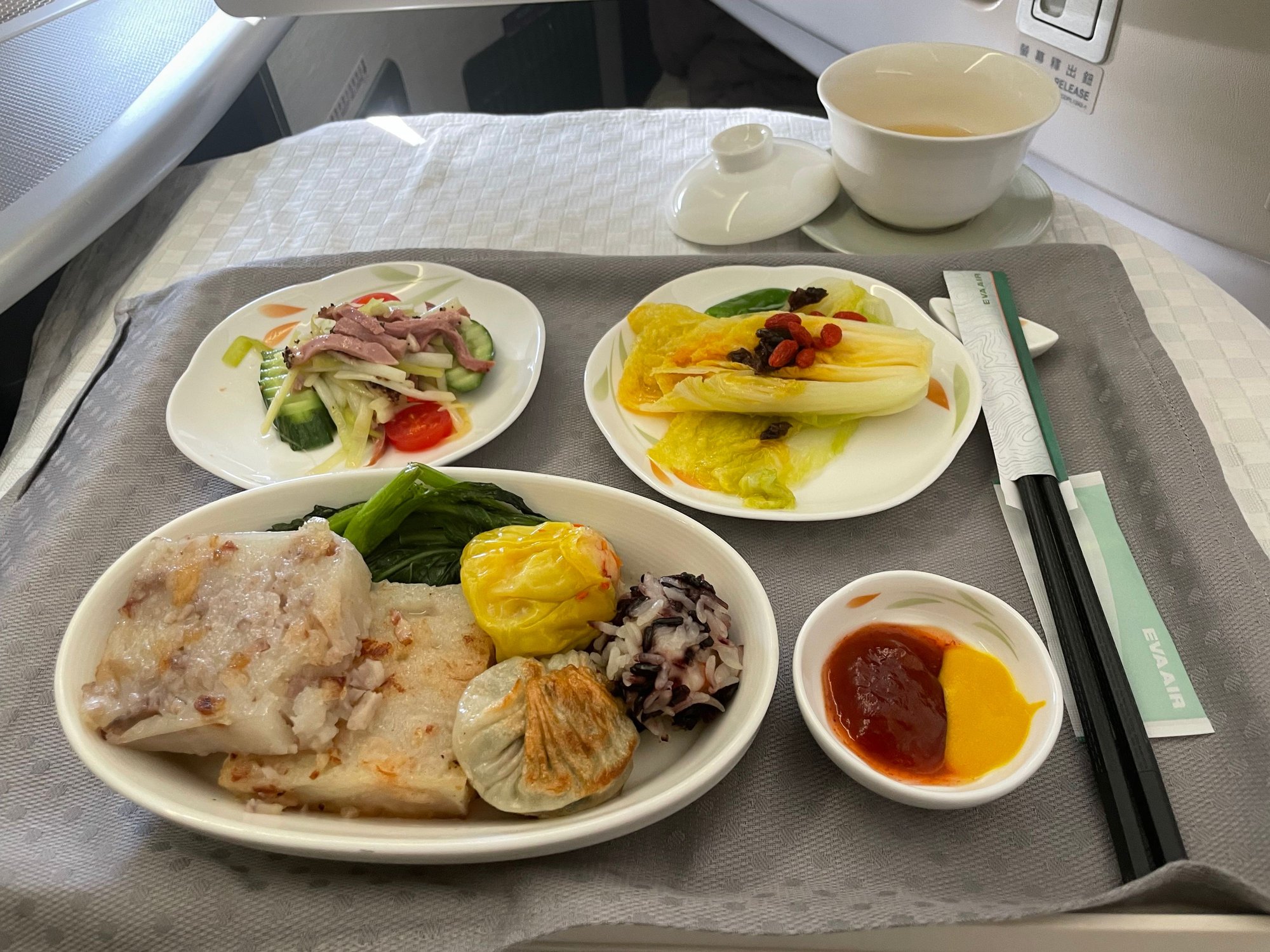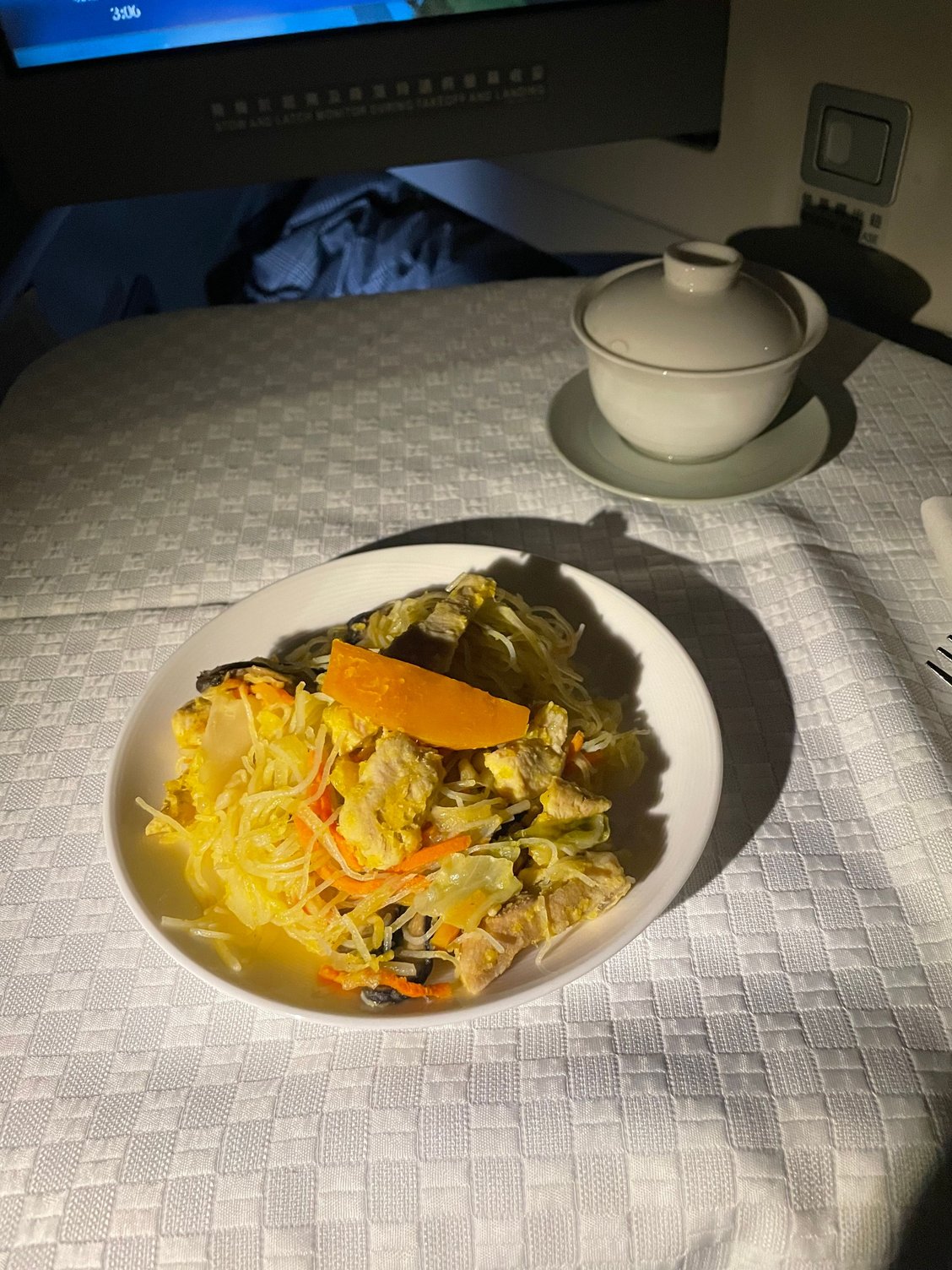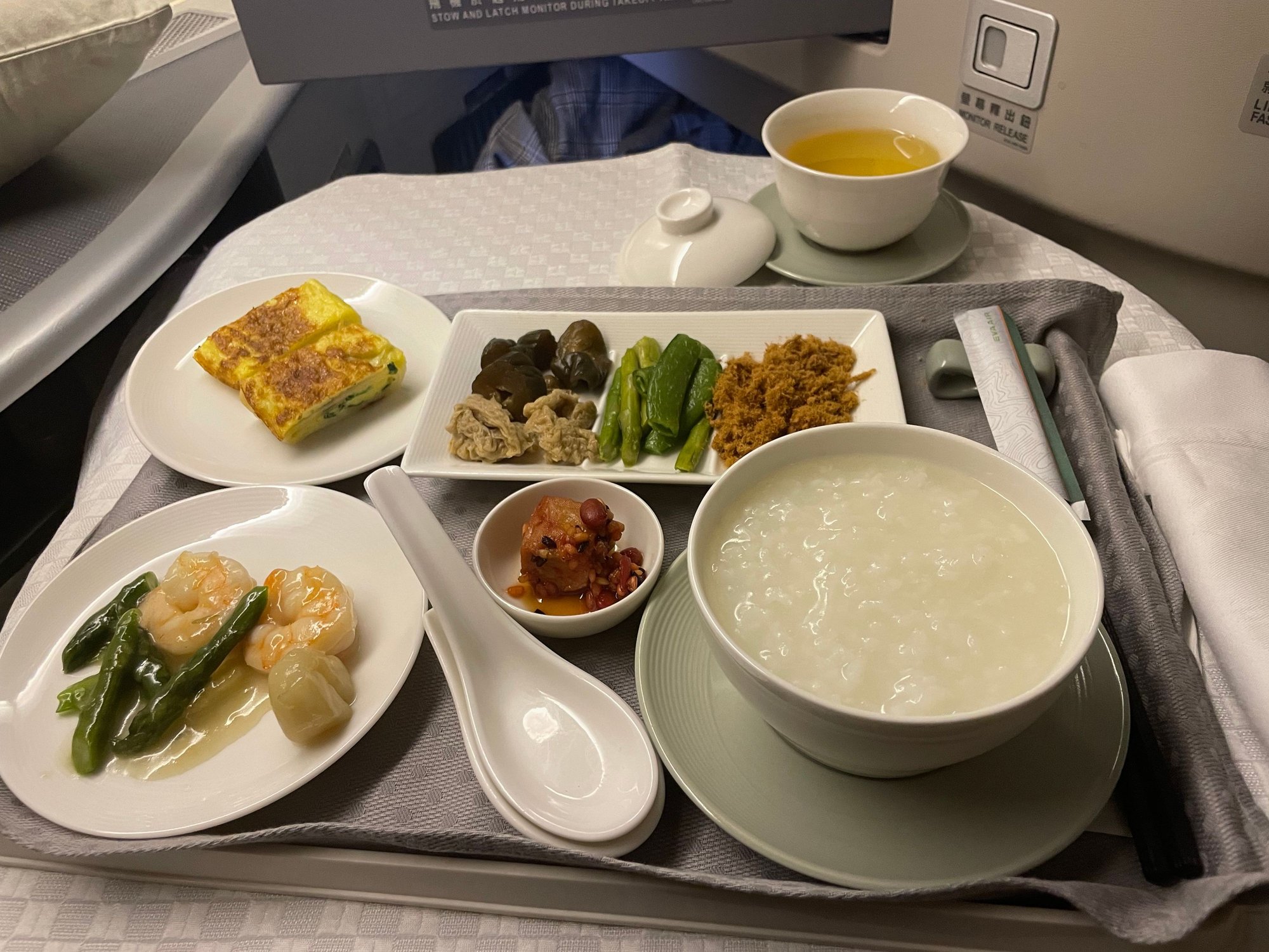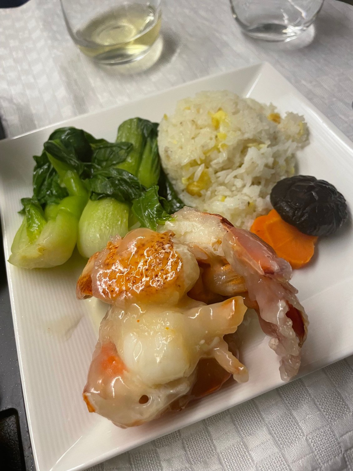 Thank you all for the input earlier! I stayed with the stir fried ginger scallion lobster with egg fried rice, vermicelli pork and pumpkin noodle snack, and congee for first flight. Dim sum for second flight (with black sesame lemon drink and passion fruit)