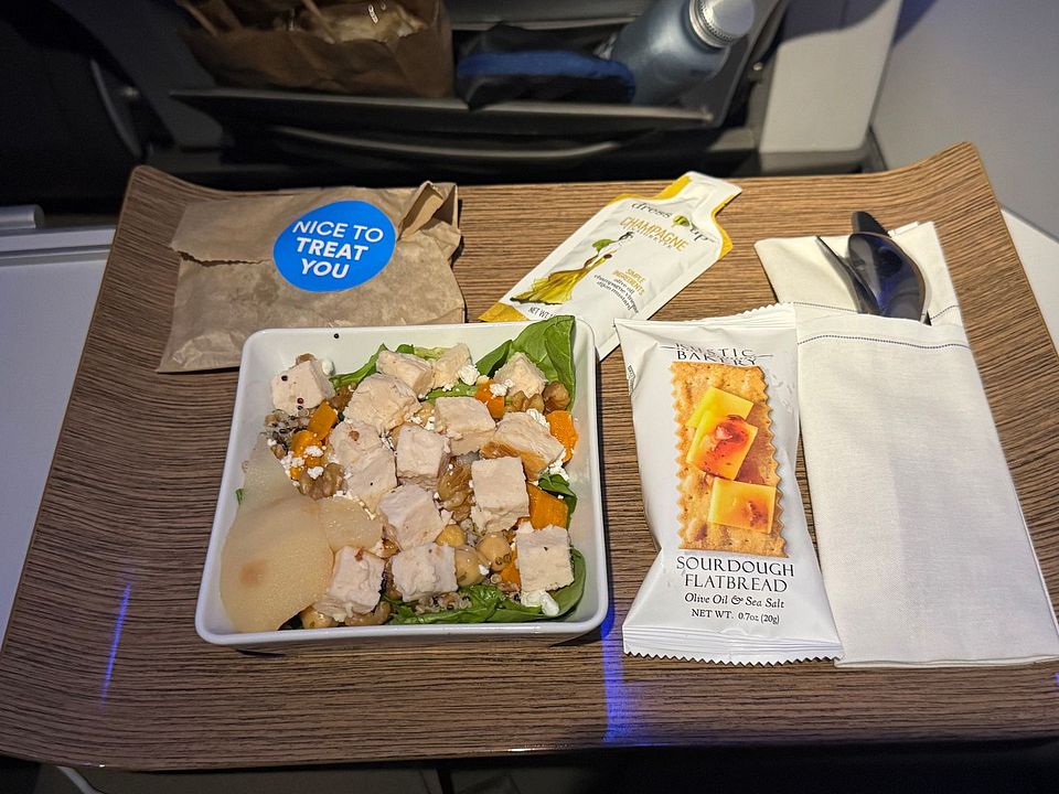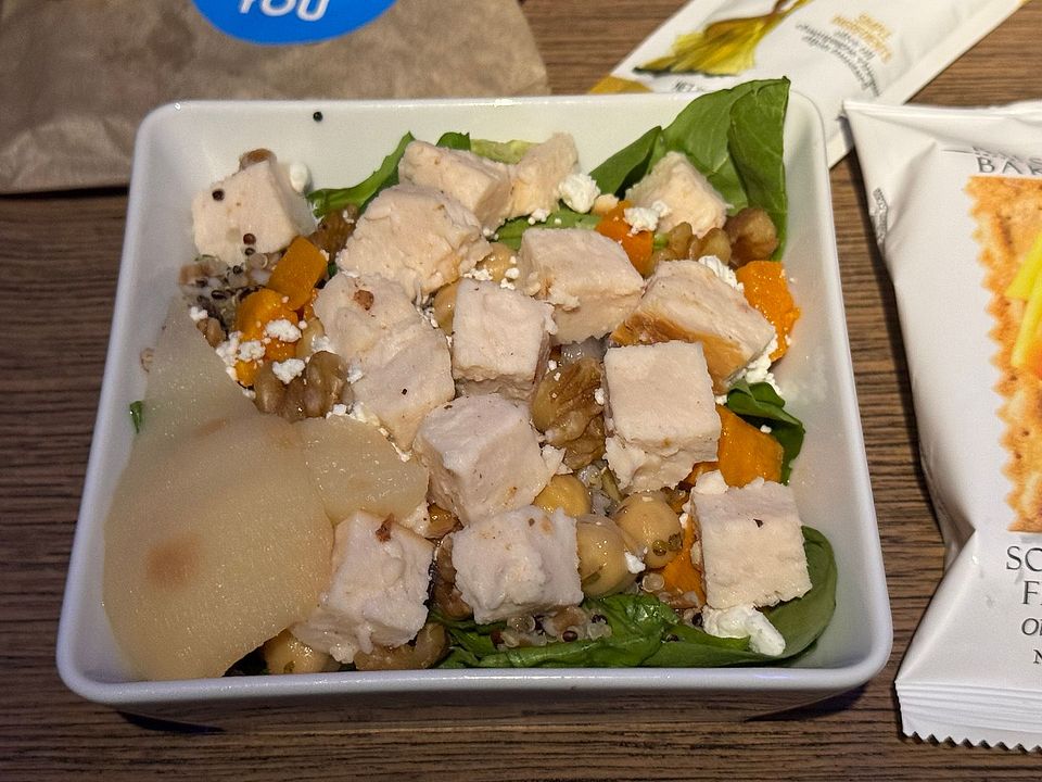 Fresh seasonal greens with fire braised chicken, a blend of farro & quinoa, roasted sweet potatoes, pears, goat cheese, and candied walnuts. Served with Dress It Up vinaigrette