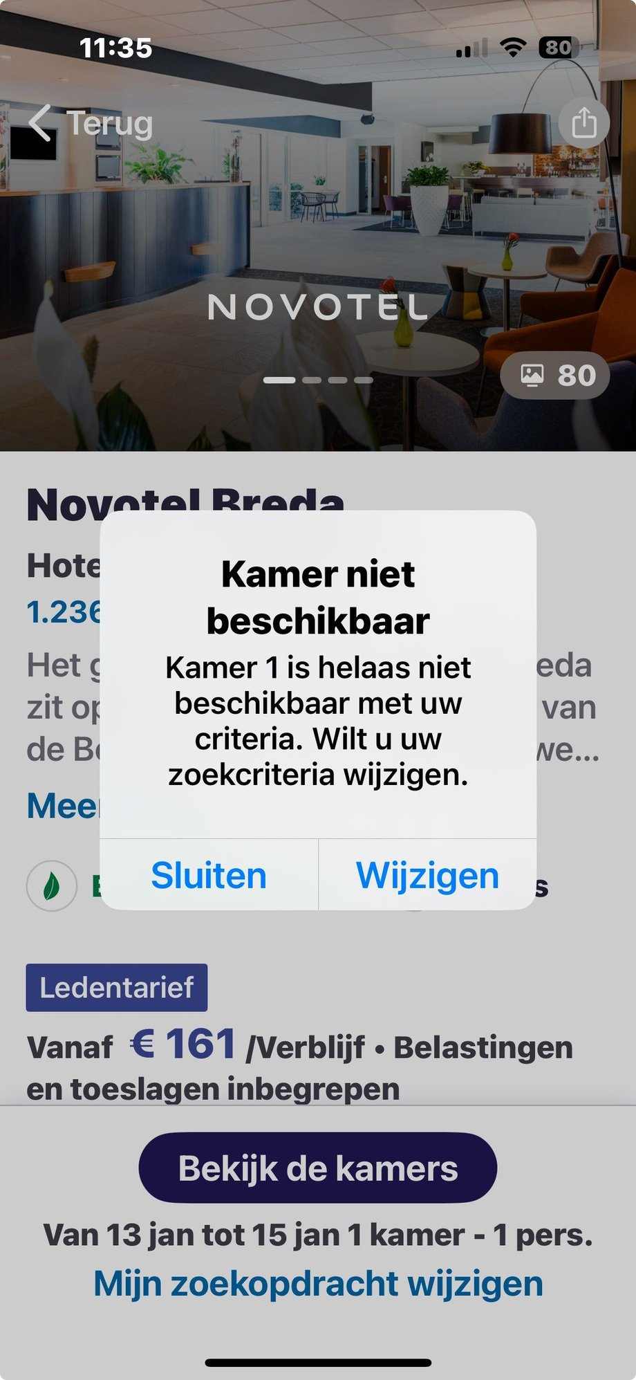 This is the message when I try to book via the app. I book 60-80 rooms a year and never had this before. The translation is: Room 1 is unfortunate not availeble with your criteria.