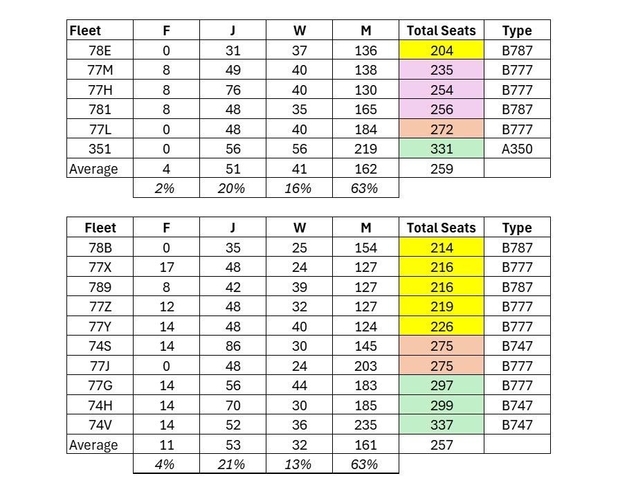 4. The 77W is the new 747 Hi- and Super Hi-J, but not quite. It carries 10 less J seats than the 74S and the same as the 74H.