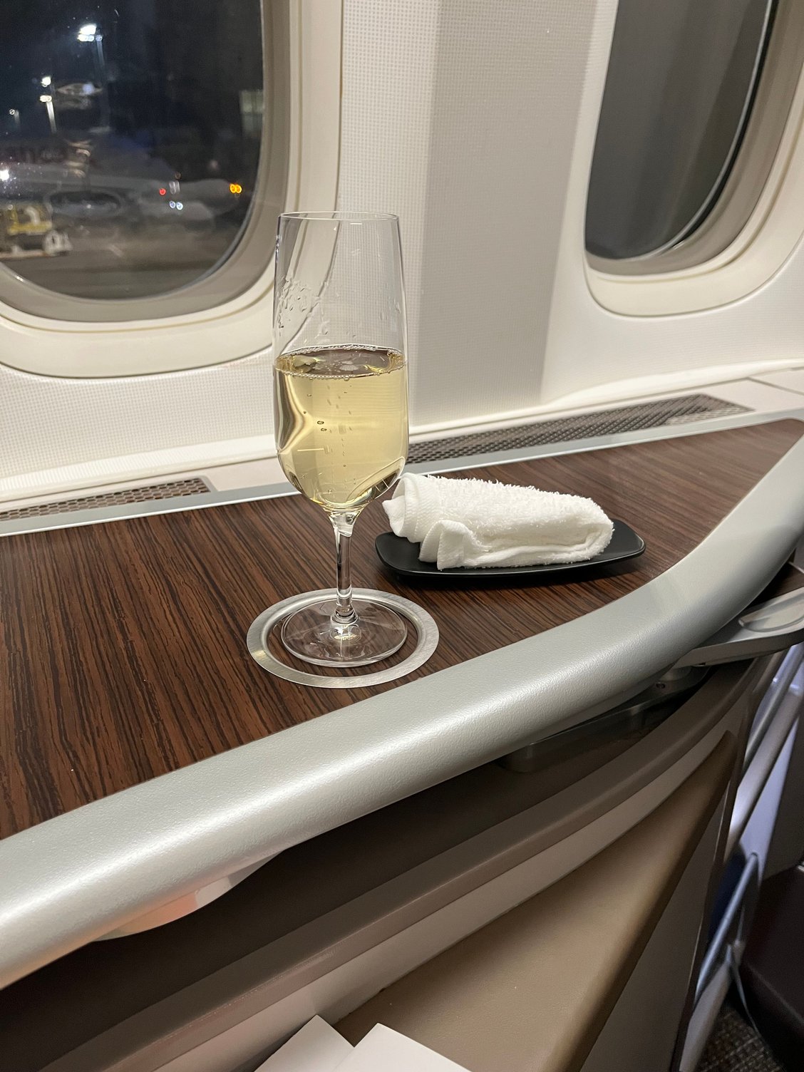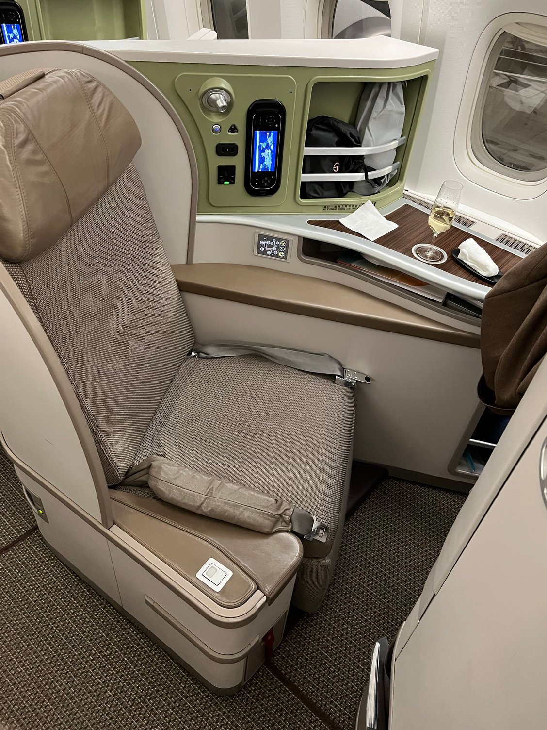 Slippers and amenity kit already on seat. Offered pajamas in medium or large size during boarding process. The Y passengers all pass through this cabin but the crew were very efficient and everything was done quickly. I am in the smaller aft J cabin.