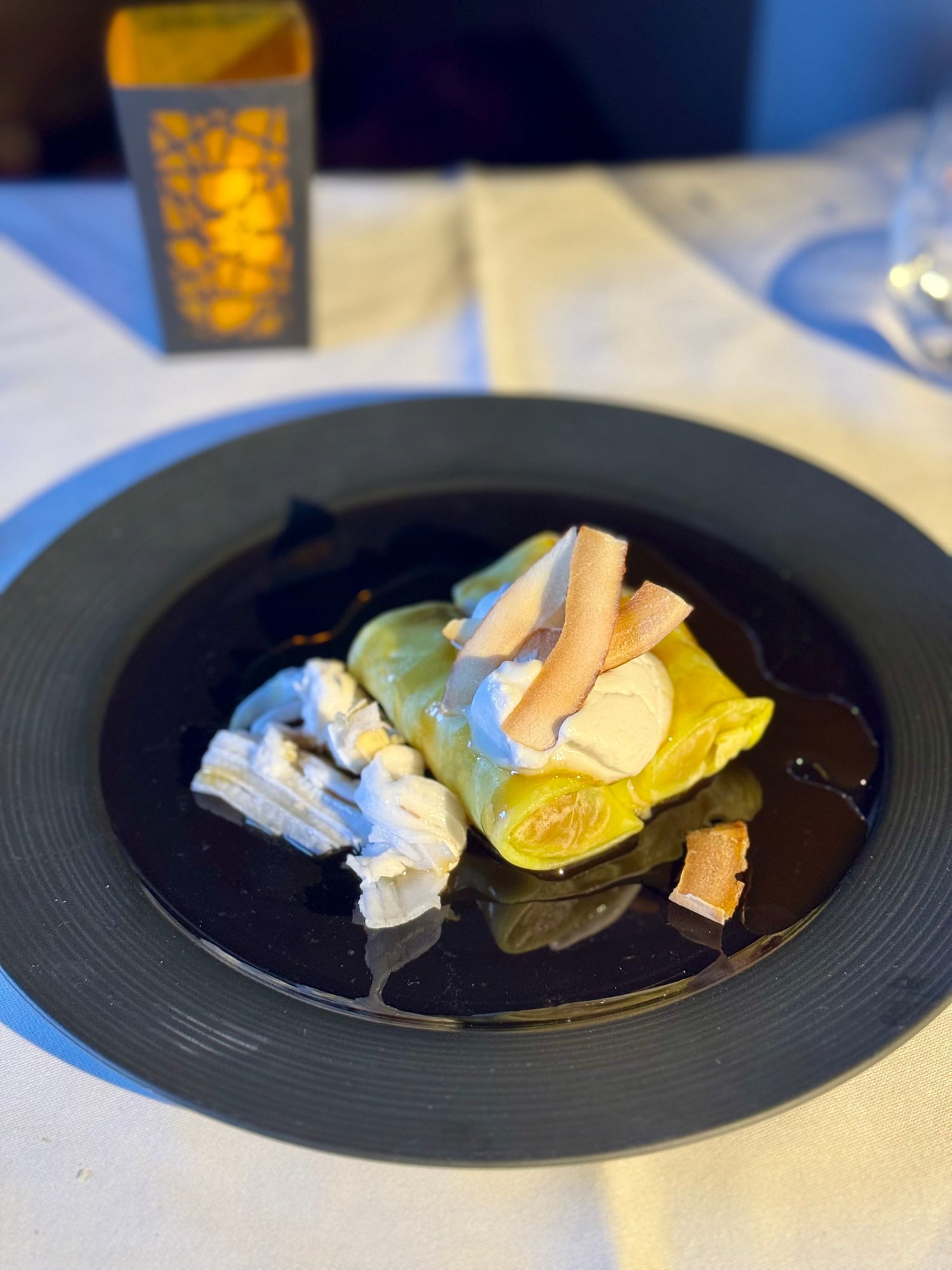 Pandan crepes with coconut cream palm sugar syrup. 5/10 as filling was way too sweet for me.