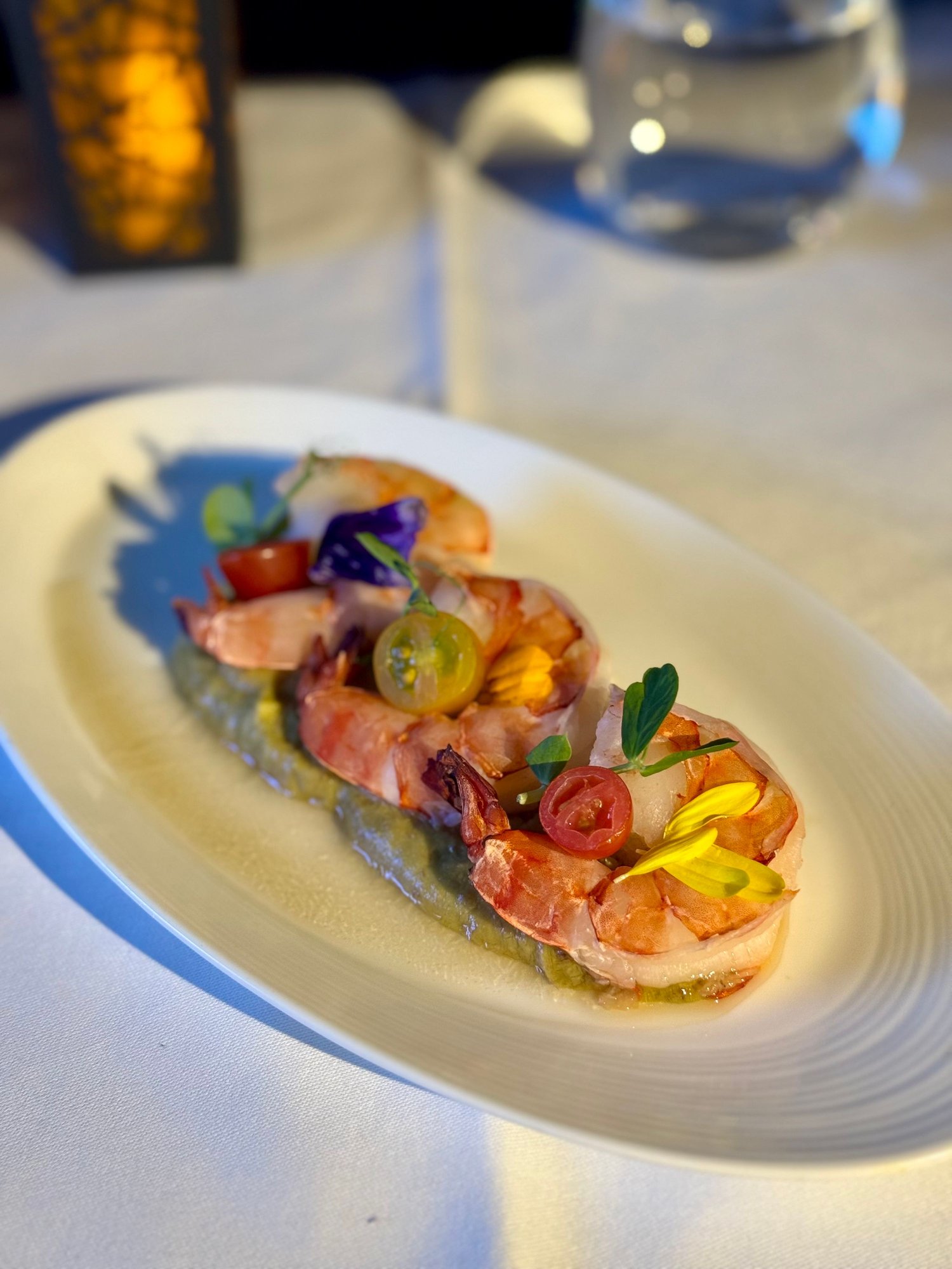 Lunch - Poached prawns with avocado purée rainbow cherry tomatoes and coriander oil.