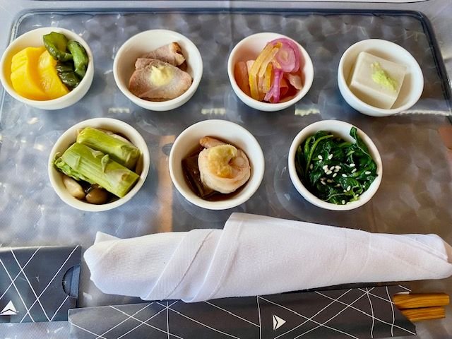 asparagus and mushrooms with ponzu jelly, fried eggplant with shrimp and grated ginger, sesame tofu in dashi broth, roasted duck with whole grain mustard, spinach with sesame seeds in dashi soy sauce, yuzu smoked salmon, spicy konjac