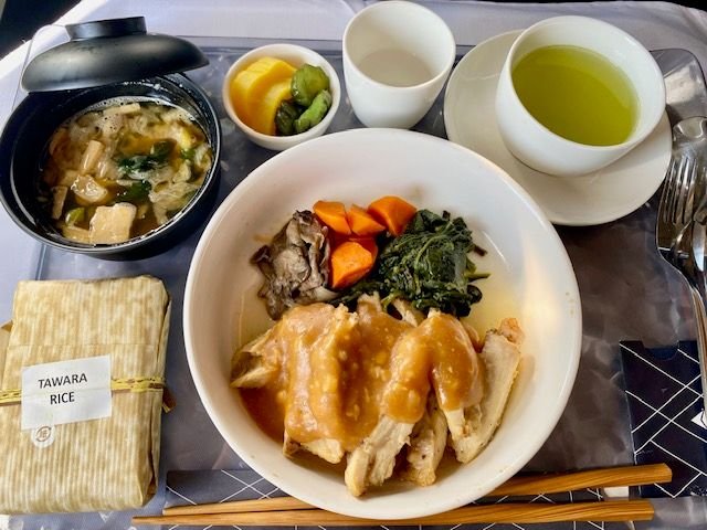 spinach, oyster mushrooms, carrots, Tawara rice, miso soup, Japanese pickles
