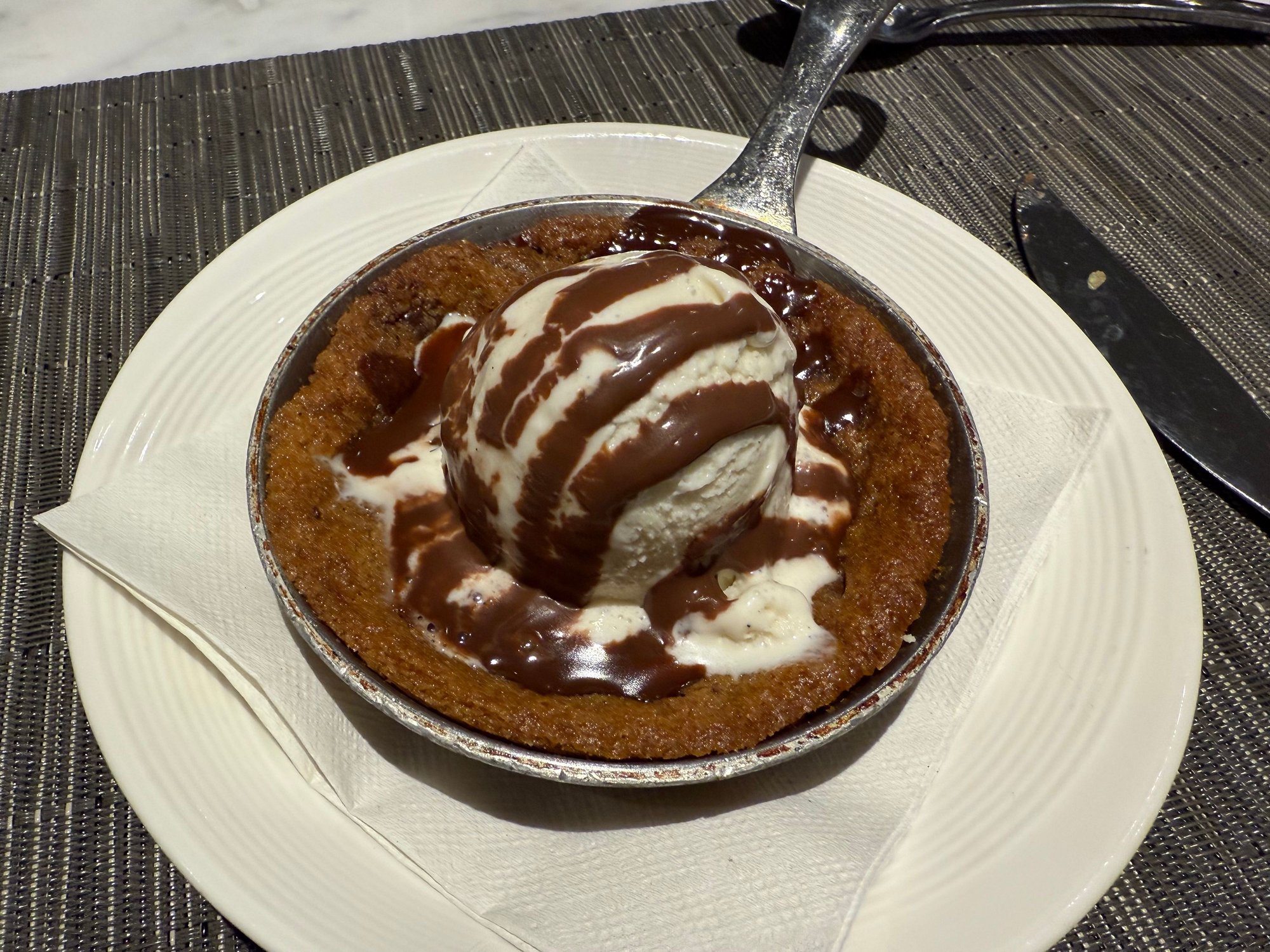 The peach tart was very meh without much flavor. Chocolate chip skillet cookie with vanilla ice cream is a can't go wrong combo.
