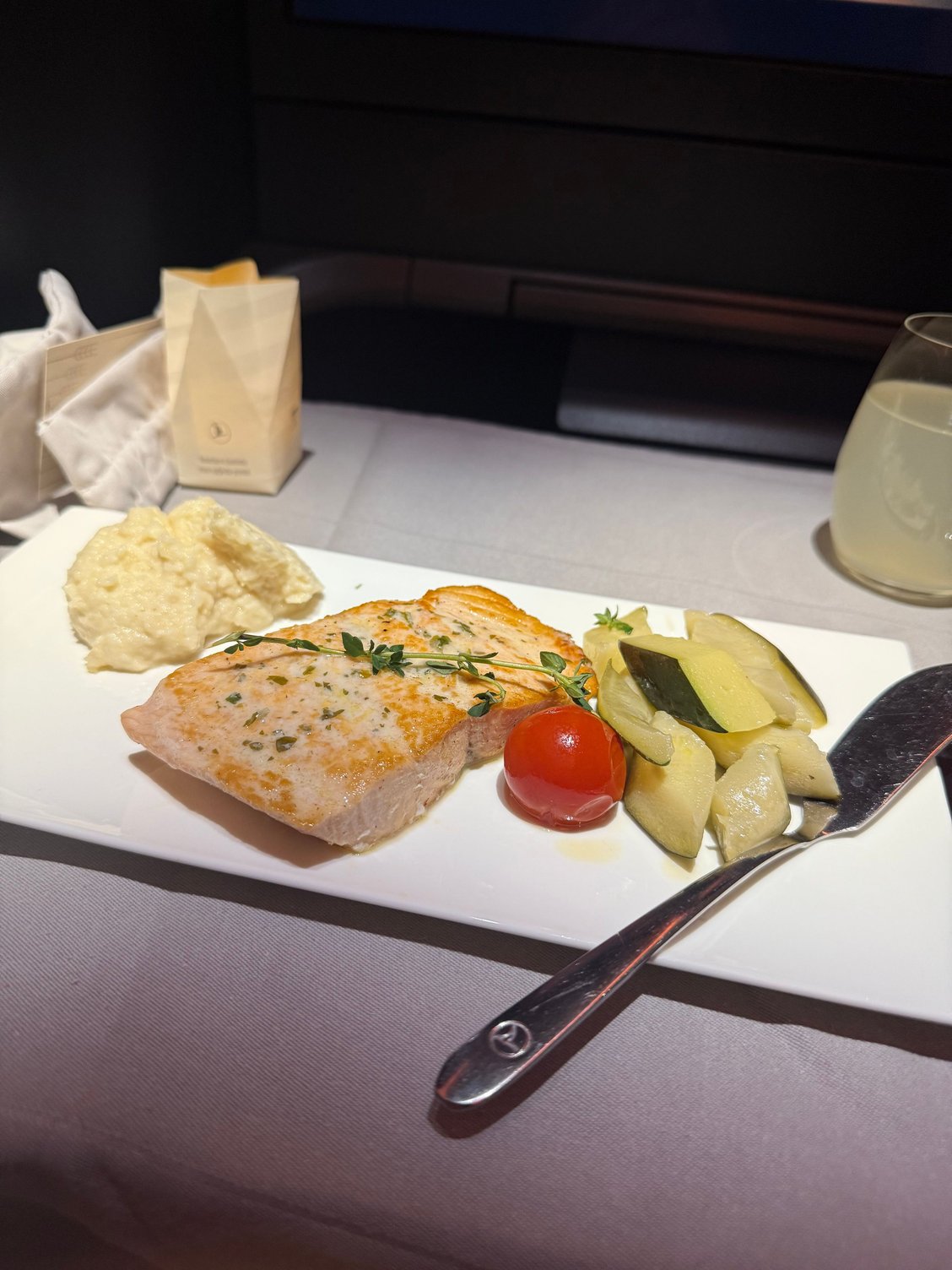 Having a lovely flight so far. Lunch was delicious and they definitely changed the menus slightly (at least out of Singapore). Only complaint is that the soup and main was bland but a little salt made great. Salmon wasn’t too dry and the tiramisu was lovely. TK 209 Sin-Ist