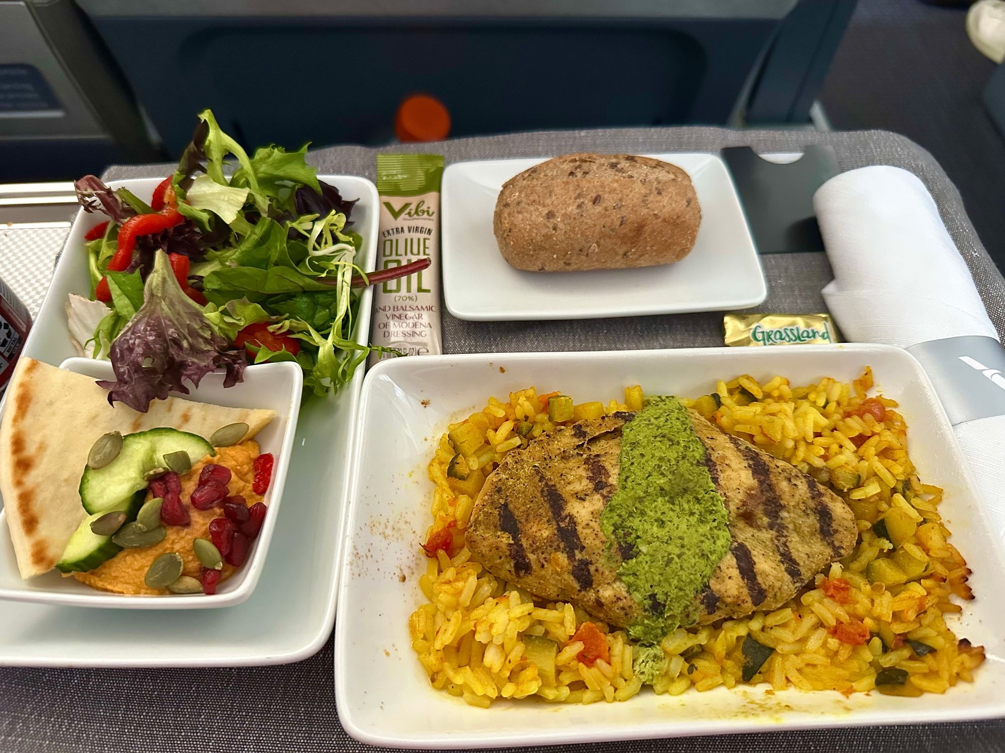 Pre-ordered the chicken shawarma. Presentation is great, but I didn’t enjoy it. Chewy Chicken. Made up for it at the LAX FL upon landing. Service pretty poor - no PDB, no refills, asked for a wine with lunch and was told “yes, but wait until I’ve served all the food”. It never came so I asked again (Chardonnay) and received a sauv blanc, no explanation. Oh well.