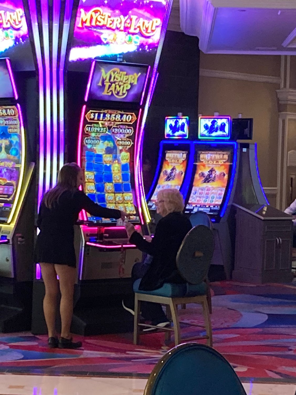 My good friend Edna Mills from Seacaucus receiving daily morning attention by the dedicated casinofloor cocktailwaitress.