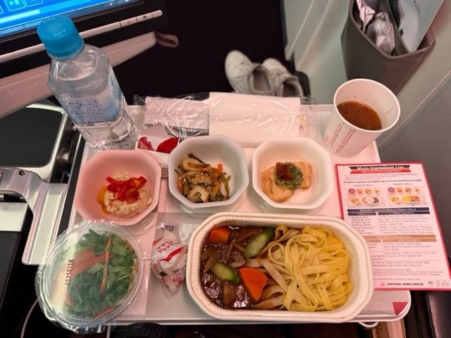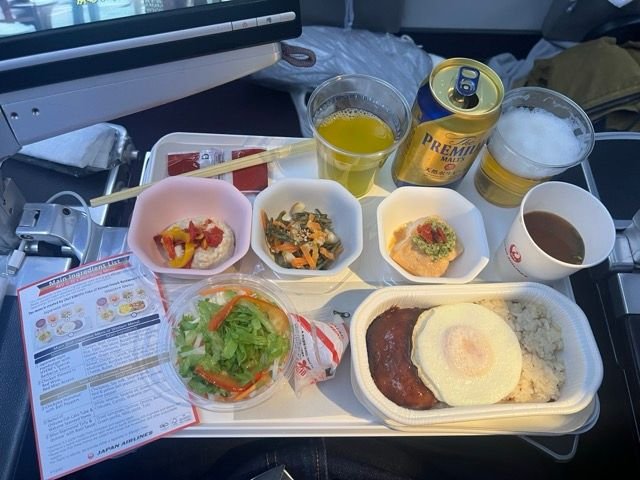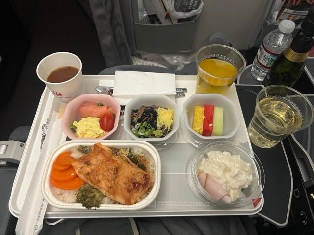 Now why on earth does JL insist on serving dinner after takeoff for a 10:05pm departure? I suppose waking everyone up at 2am origin time/4am destination time for breakfast before a 5:40am arrival is also silly, but they seem to think that is appropriate for J pax. Maybe there are too many pax in PY/Y to allow for a timely meal service?