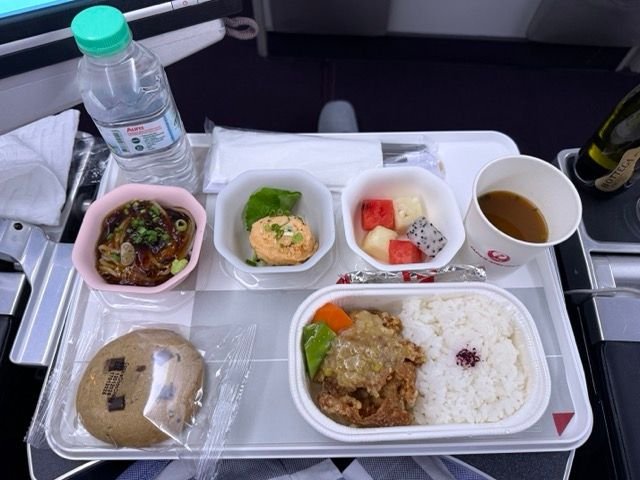 Standard TPAC main meal after takeoff and a smaller meal prior to arrival. Not pictured were a mid-flight snack beef bun of some sort (delicious), obligatory Udon de Sky (delicious), and too many bags of rice crackers.