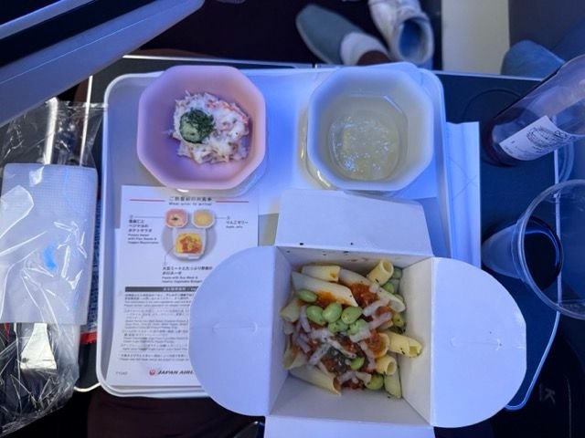 Penne with plant-based bolognese. Now I can never understand for the love of anything why JL cannot just serve a regular pre-arrival meal in Y. This pasta-in-a-box is unnecessarily unhinged.