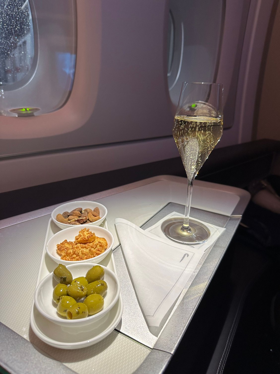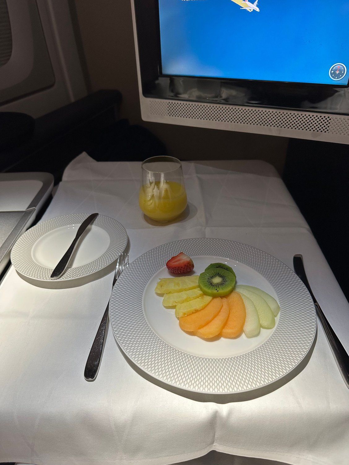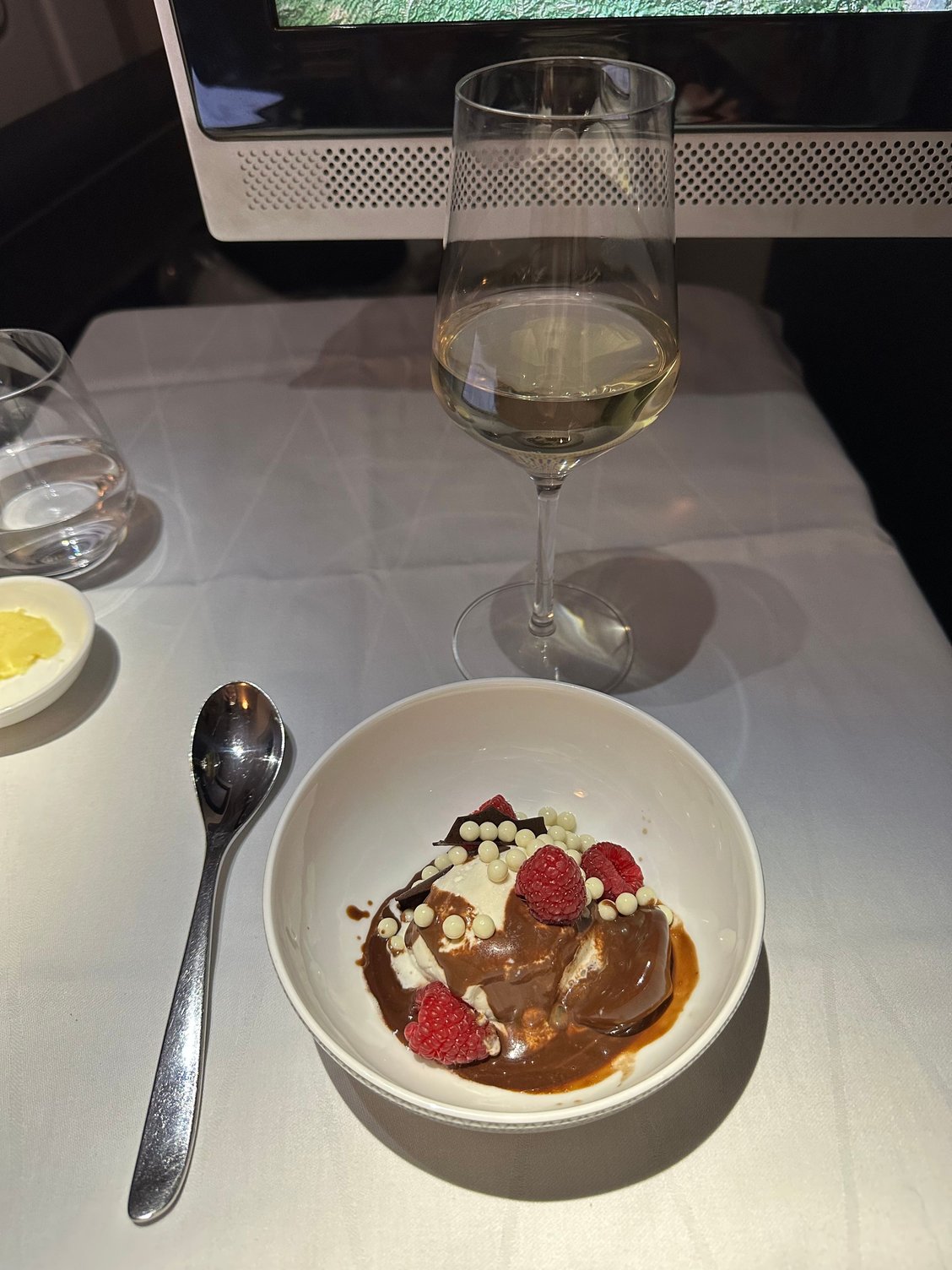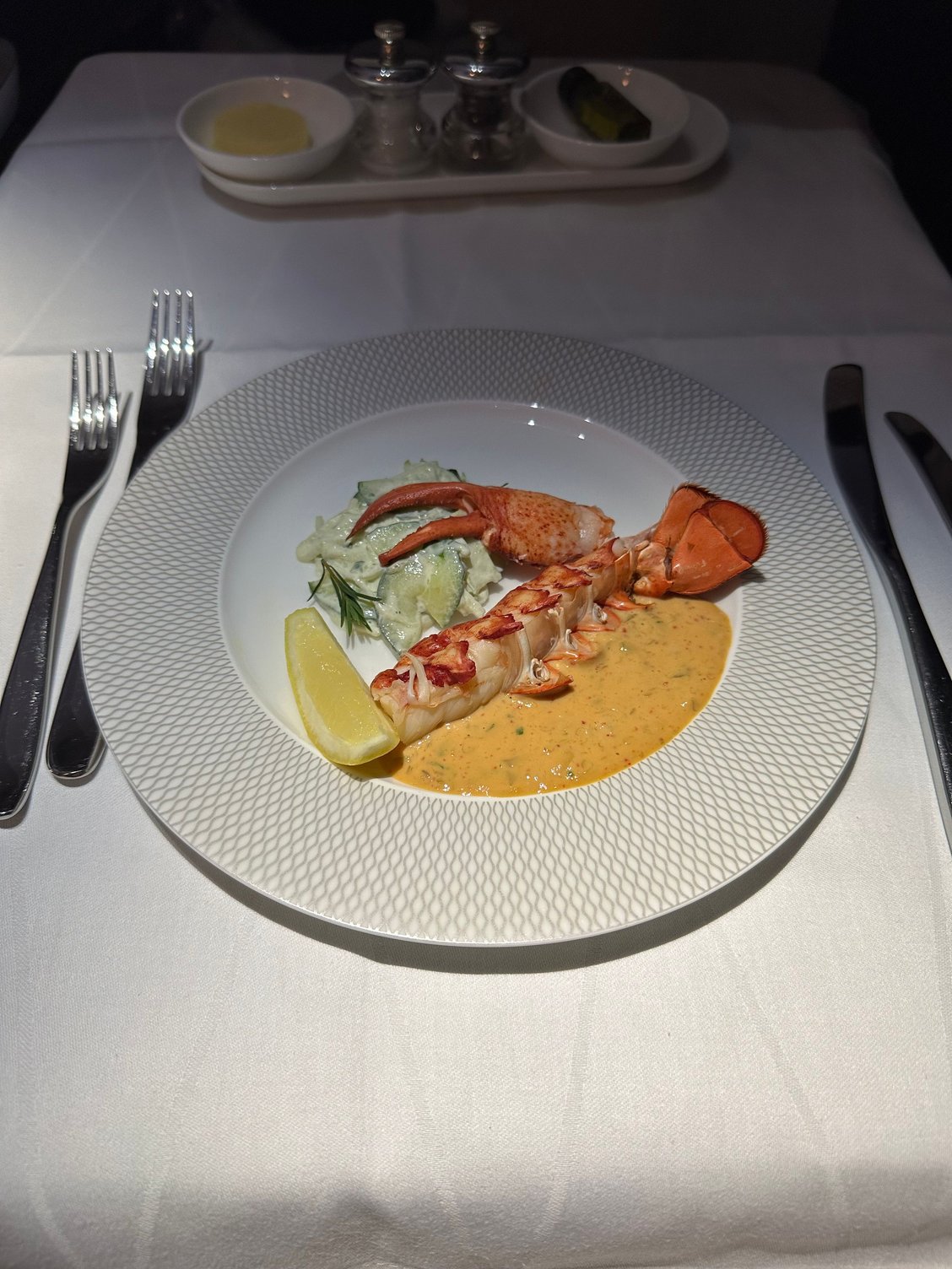 Enjoyed my flight recently with an enthusiastic though not totally polished crew. The odd thing was forgotten at times (water, bread, some of the cutlery….) although soon appeared when I reminded them. I enjoyed the pre departure snacks, could take or leave the amuse bouche and really enjoyed the lobster. For the first time for me in a good while the fish was overcooked although the veg were cooked to perfection. Unlike many crews the ice cream was served in an edible state rather than still frozen solid and needing s chisel to eat. My requested glass of Mullineux never materialised as it seems it hadn’t been loaded although the Dog Point was perfectly acceptable. I just had the fruit plate before arrival which was as well as had I have been hungrier I’d have gone for the omelette which it turns out was very popular and there weren’t enough to go round.