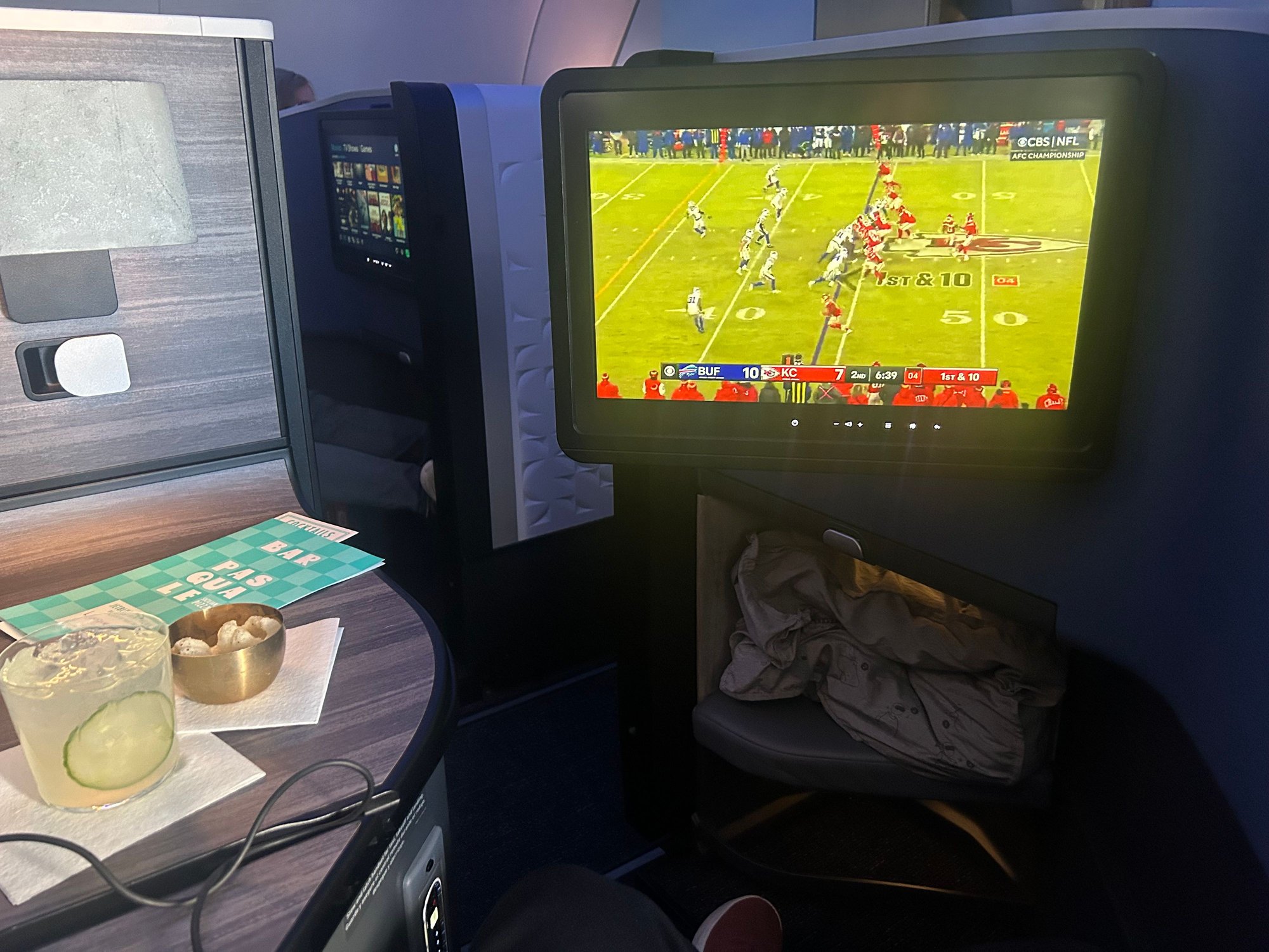 Mahomes vs Allen from 36k ft. The 17" screen is outstanding, along with the memory foam like seat and all the other bells and whistles in the suite.
