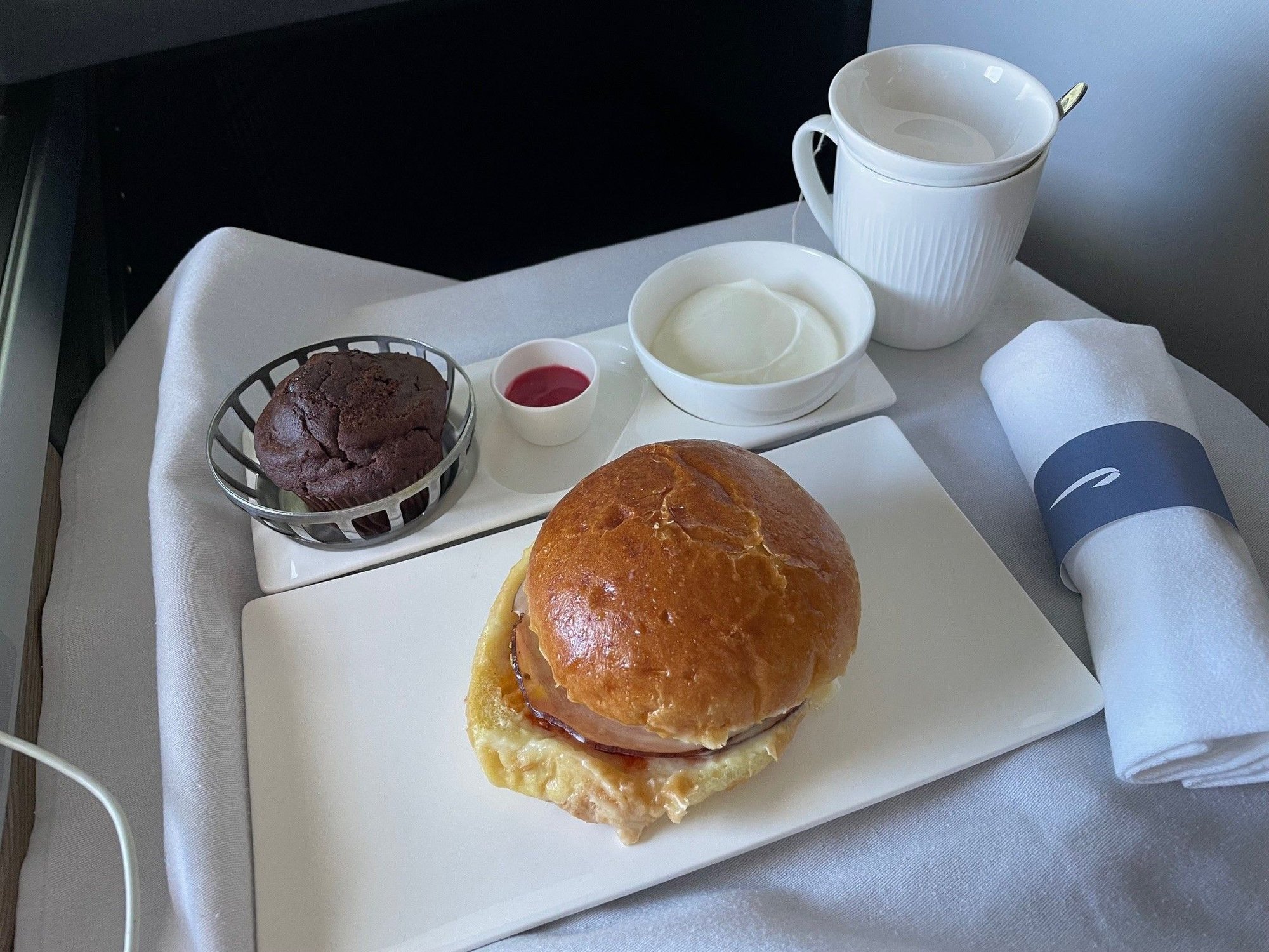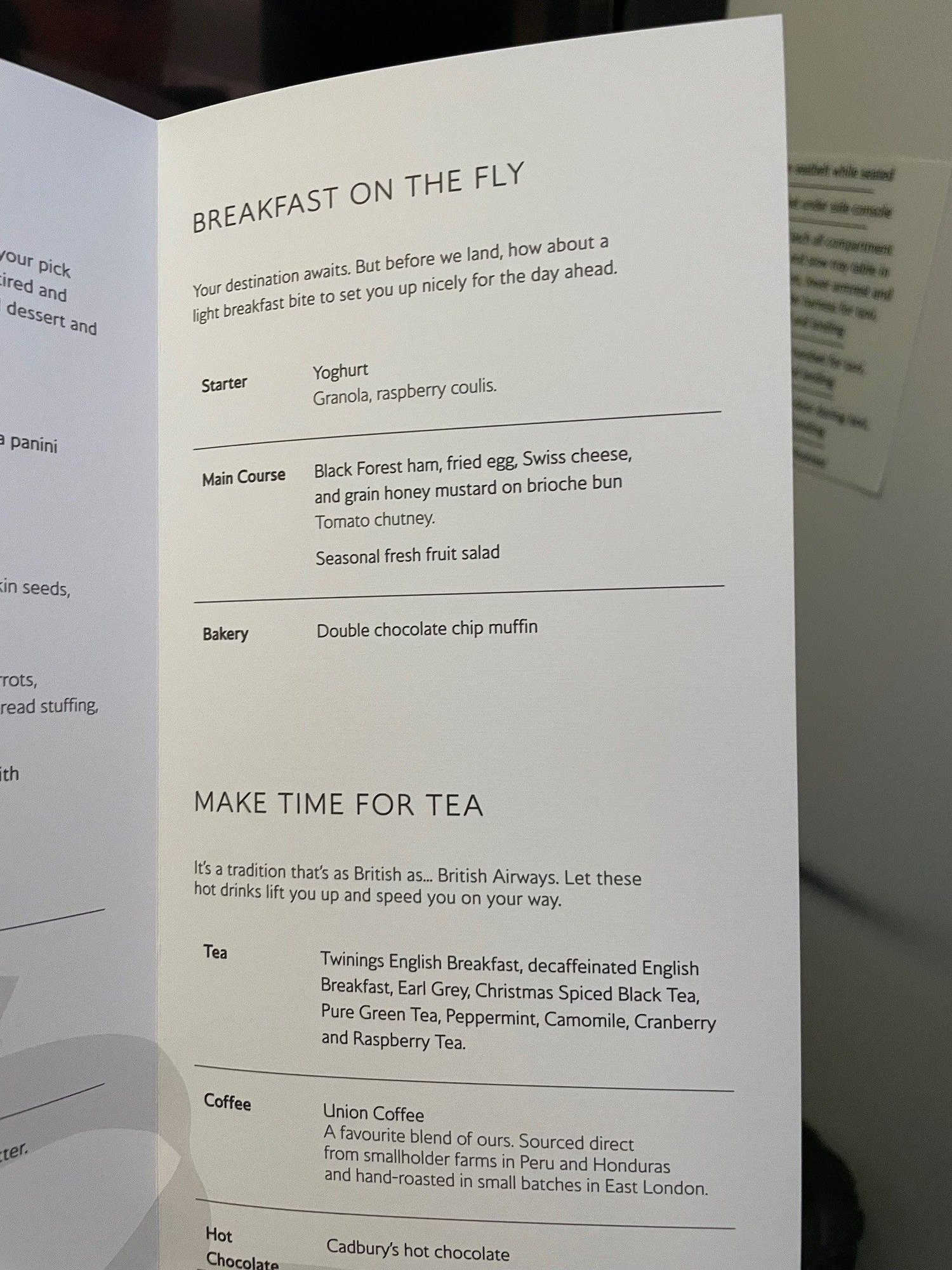 Breakfast was . . . fine. I really wish BA would offer something between fruit and a greasy breakfast sandwich on these flights. Yoghurt and granola perhaps?