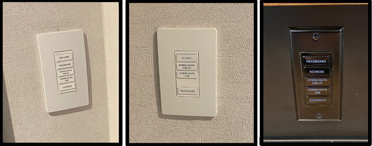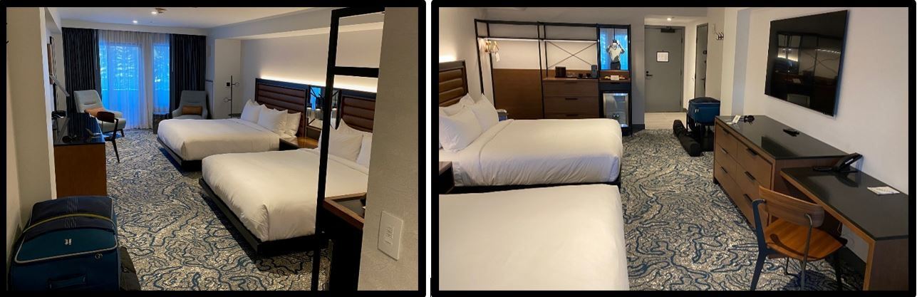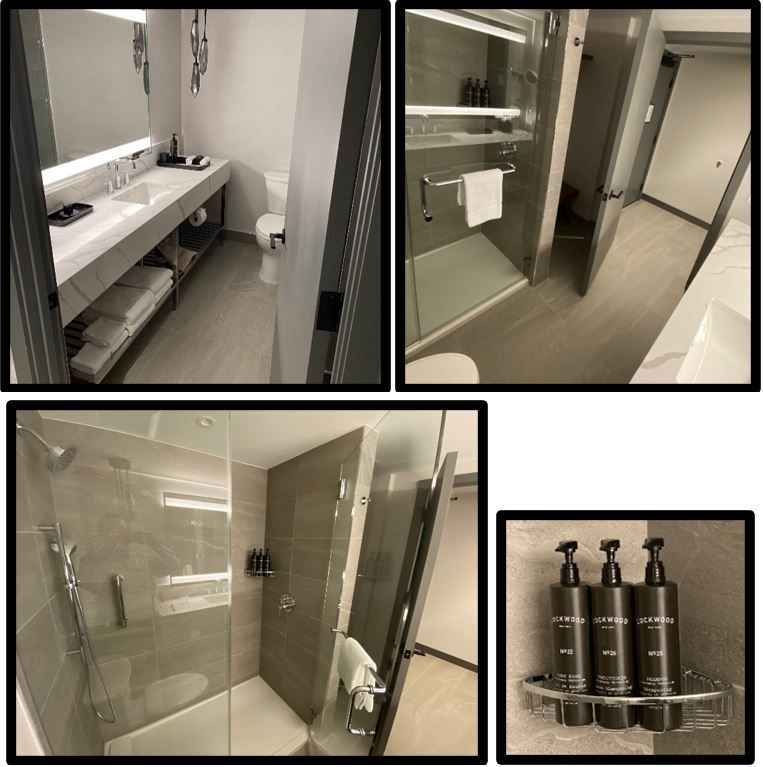 Rooms include a mini-fridge and in-room safe and small open “closet”. Uncommon light switches. Hint: to turn on all the bathroom lights, press the bathroom light switch