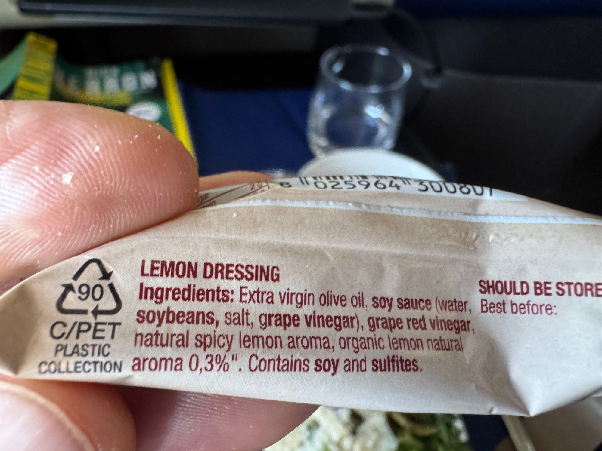 Haddock was a bit overdone but still good. Mystery red sauce did not go well with the fish. The puree looked like soylent green but tasted remotely like cauliflower. Odd extra piece of garlic toast in the main dish, but it was good. The burrata appetizer was a bit watery but tasted good. The salad was tasty. I continue to be amused by the 'lemon' dressing. I managed to capture the ingredients list to show that it's only got 'natural spicy lemon aroma' in it, the acid is grape vinegar. The roll was good and hot. The sundae was good. When I asked for chocolate sauce he said "do you mean the chocolate chunks?" and put the chips on. It was tasty and not too cold or warm.