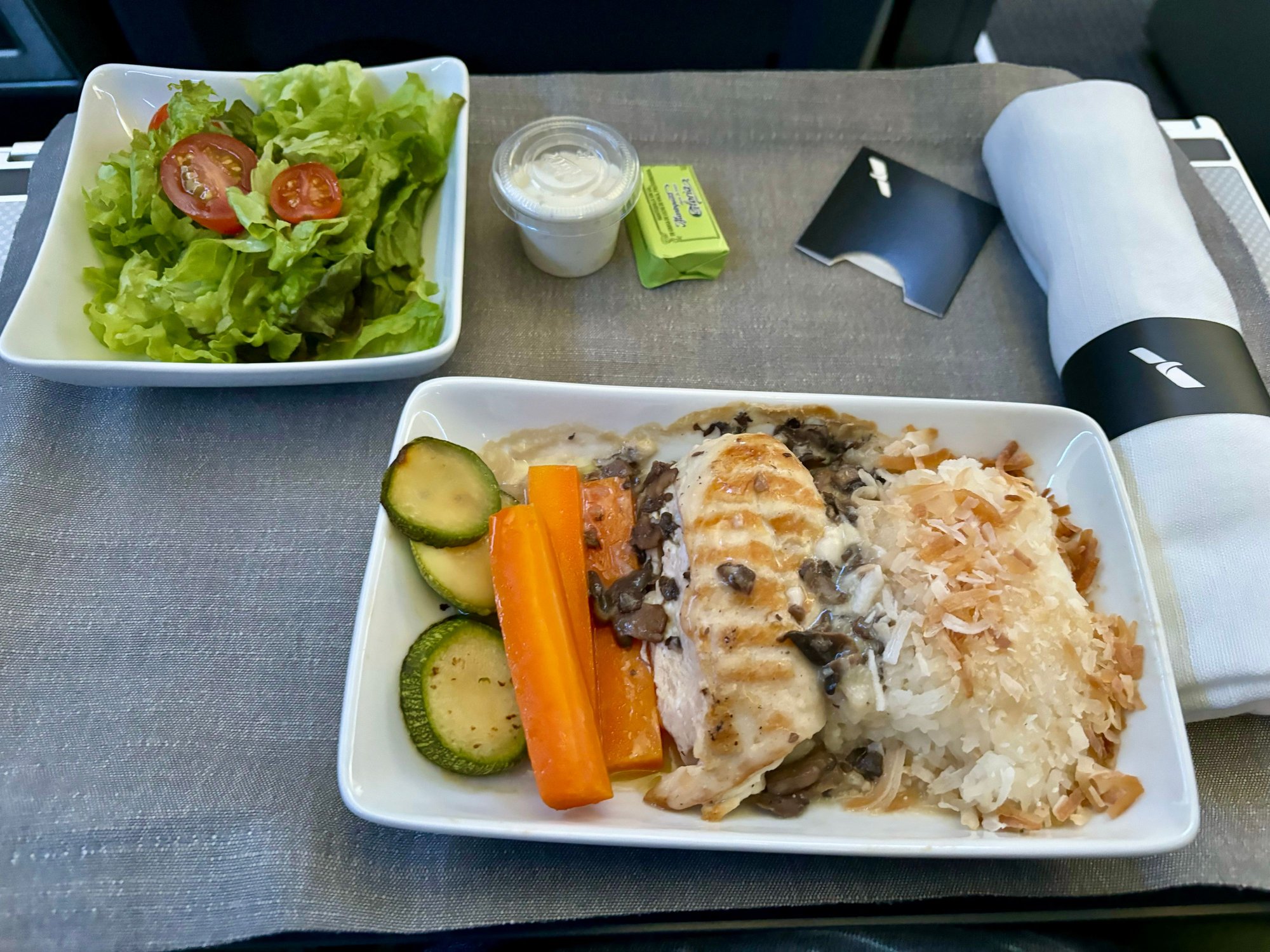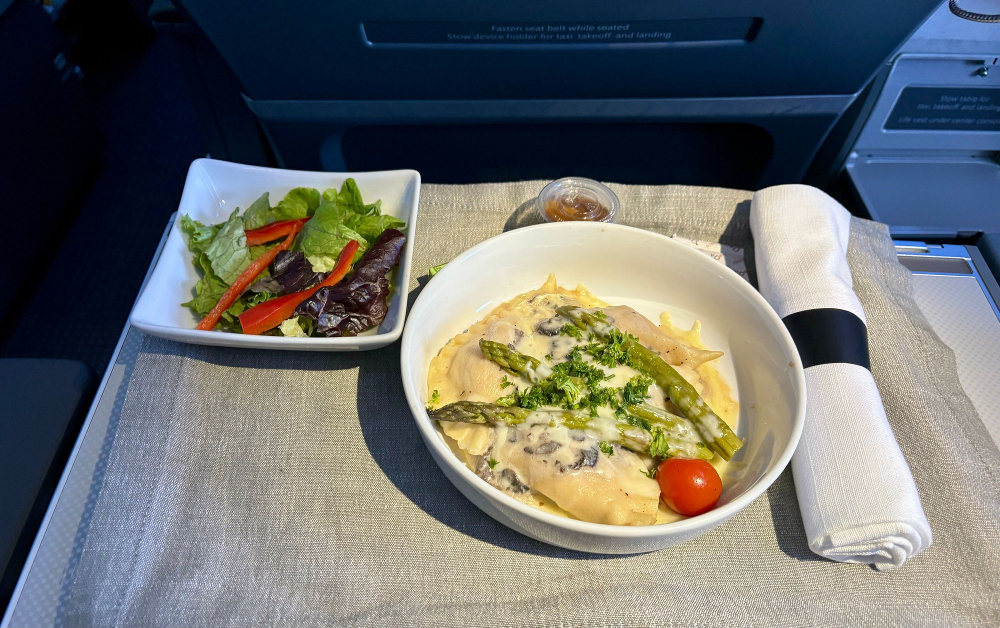 Unfortunately for your sweetheart, out of Mexico, there’s only 2 choices and in this case, both are served with copious amounts of mushrooms. While the food will be better than anything else AA serves, if you have a mushroom allergy, on this menu, you’re SOL. Here are pics of both dishes and you can decide if they look too ‘shroomy for you: