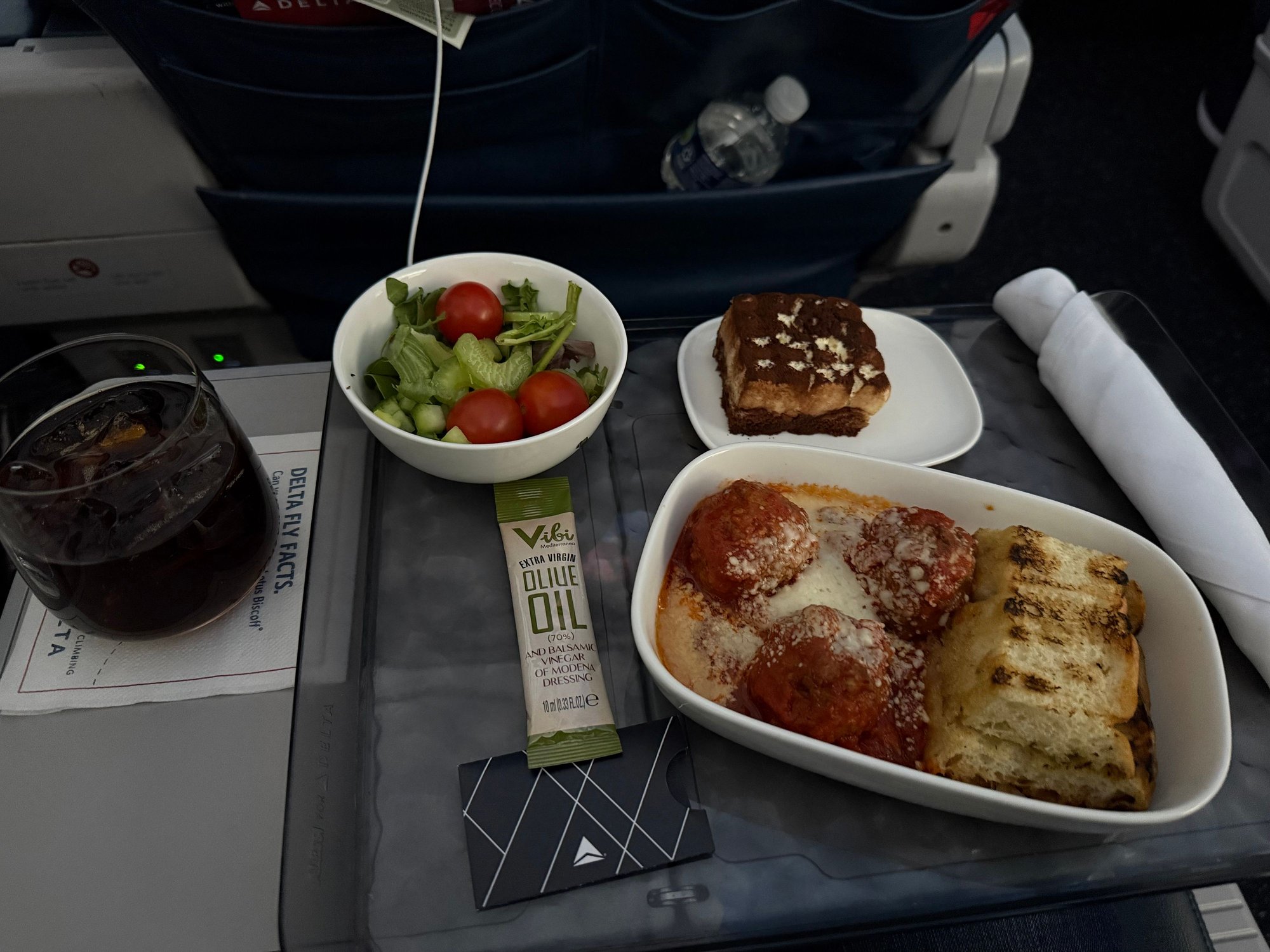 Preordered the J&V meatballs for lunch, came with a side salad and tiramisu. It was unfortunately missing the ricotta, and the flight wasn’t catered with tablecloths. Overall pretty good, but the ricotta dollop makes this dish so much better.