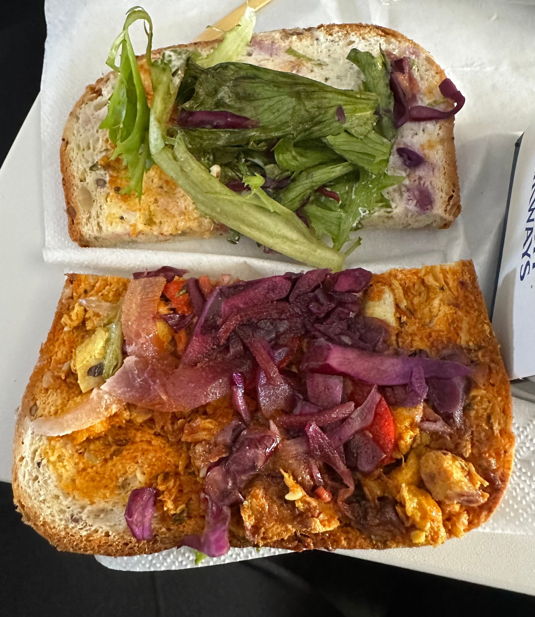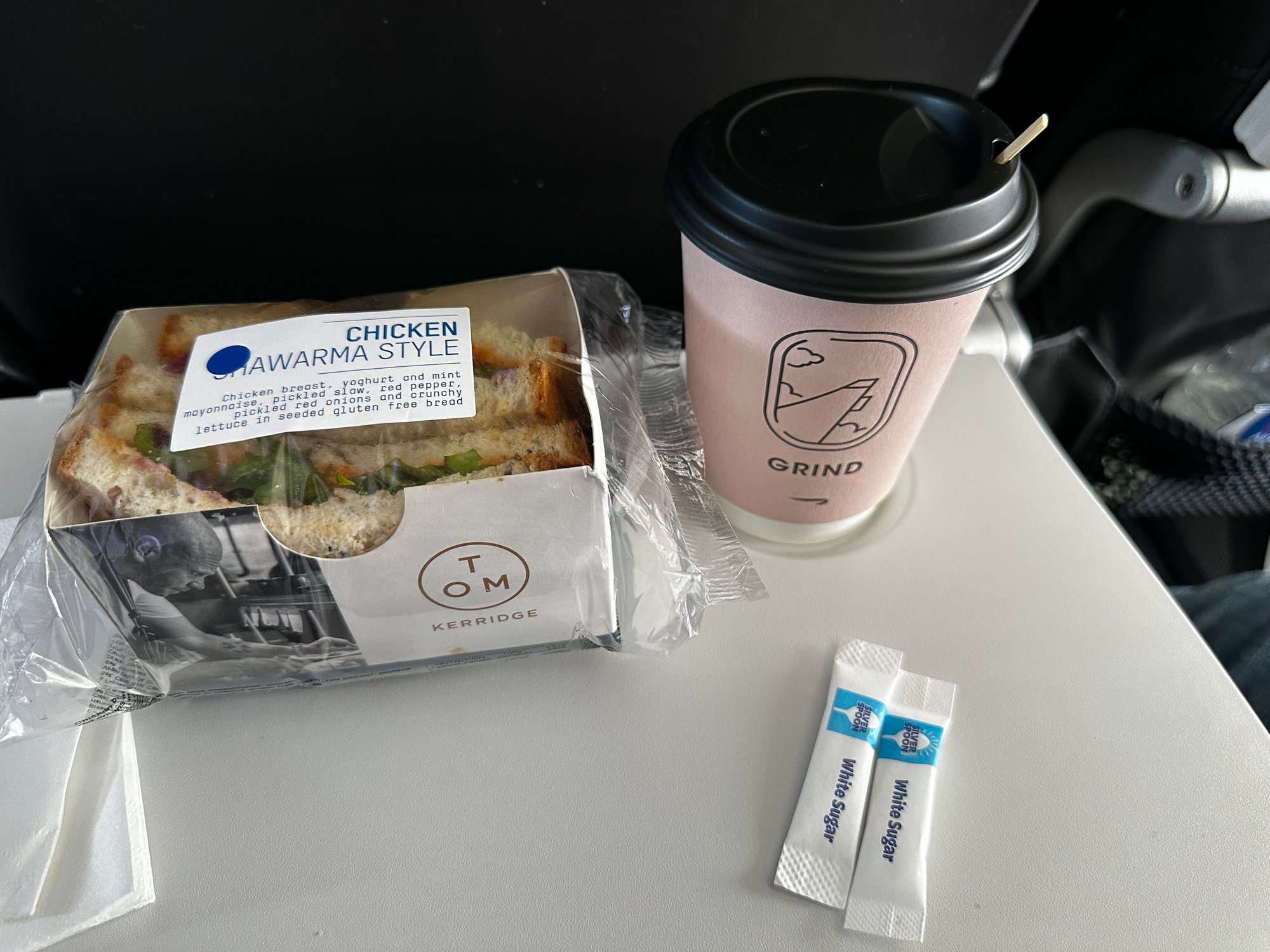 The buy on board that I had preordered was the new chicken schwarma sandwich plus a flat white coffee. The chicken filling was pretty tasty, my only complaint is the bread was a bit dry.