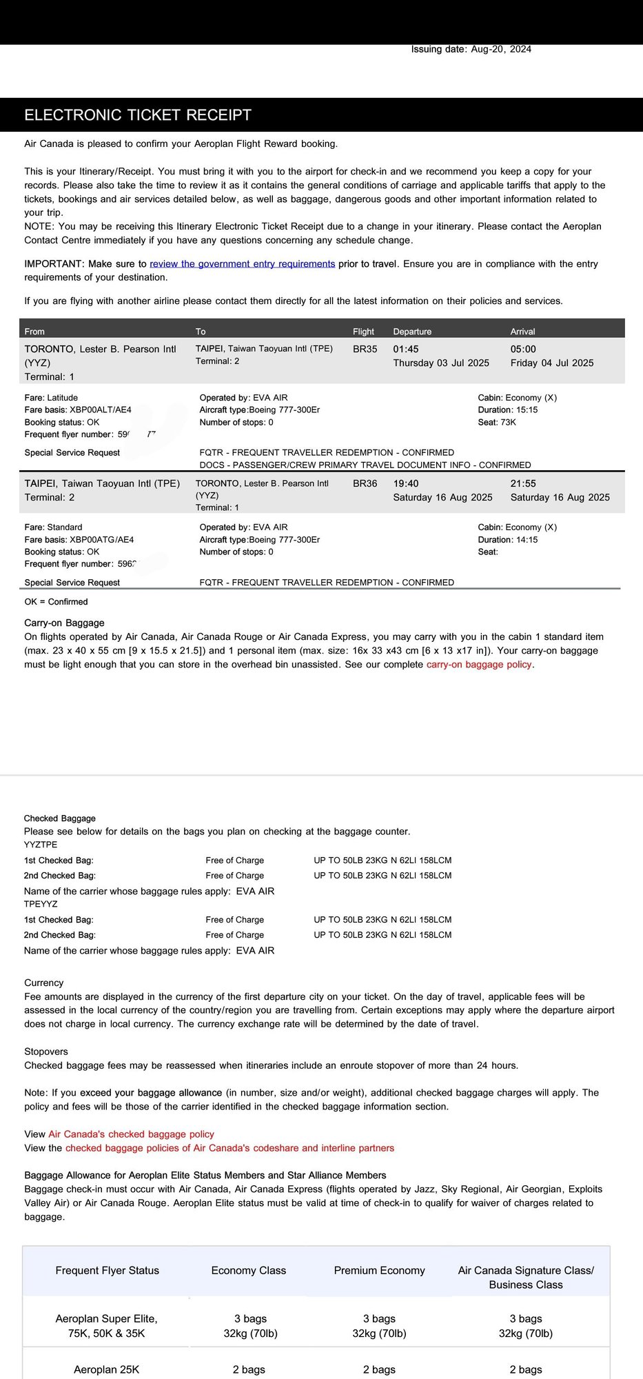 whether BR Latitude or BR Standard redemption all have two baggages free if flying direct to TPE. Who said business class redemption tickets will get two baggages Free?? Even you could afford I class business flexible award ticket, you still could end up with one baggage free. So is X class really matters? My experience and attachments all shows first operator determining baggages allowance, whether business flexible or Economy Standard redemption, if someone saying otherwise, please attach screenshot and ask, don't make any speculation without seeing how the ticket was booked at the first place