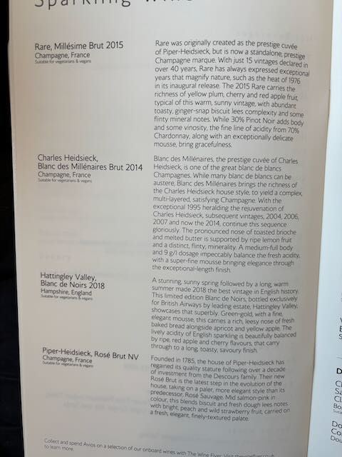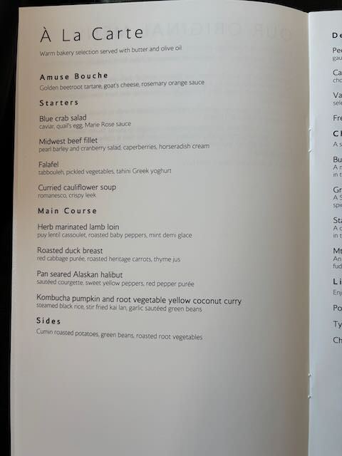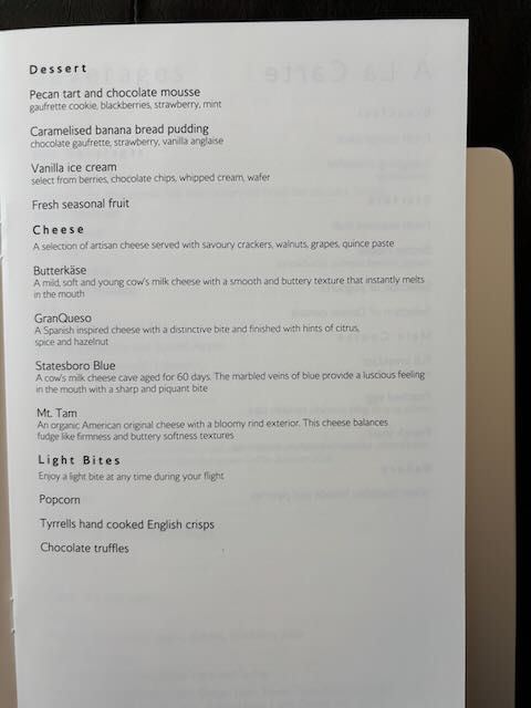 Menu and wine list from Seattle earlier this week. Pretty uninspiring all in all. The beef salad was ok but bland, the halibut dry and the puree reminiscent of tomato sauce. Cheese was good and I didn't bother with desert. Wines were solid although the Greywacke was substituted with Dog Point. I missed breakfast and ate in the Concorde Room in the Arrivals Lounge.