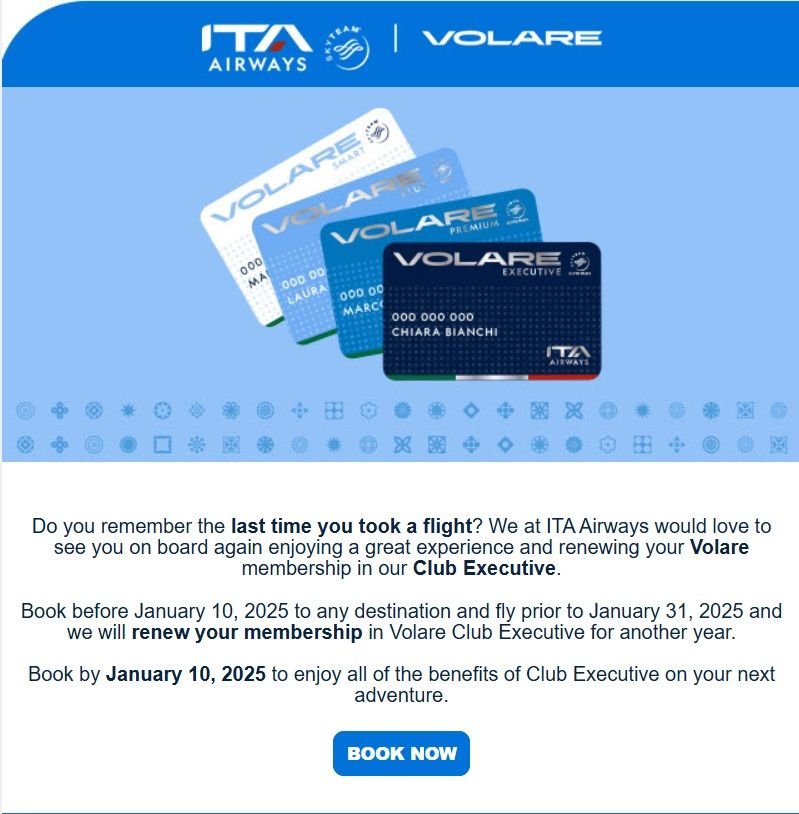 You would have received an email offer in December, whereby your Executive status was prolonged for another year if you booked and flew with ITA before the end of January.