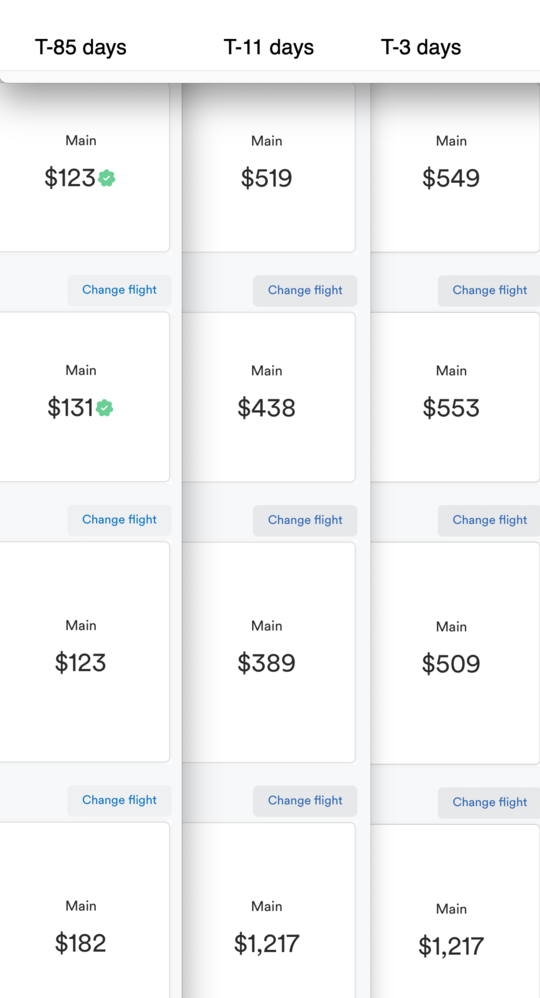 If there is one thing I have picked up on long ago, it is that you need to get the ticket while you can. You can't get sidetracked by the chance of a pre-departure beverage, the model or color of the aircraft or which gate it might leave from. Some sales are for just one day, and it helps if you are ready and flexible, or prices are going up. Here is the price escalation for a four segment mileage run I'm embarking upon soon.