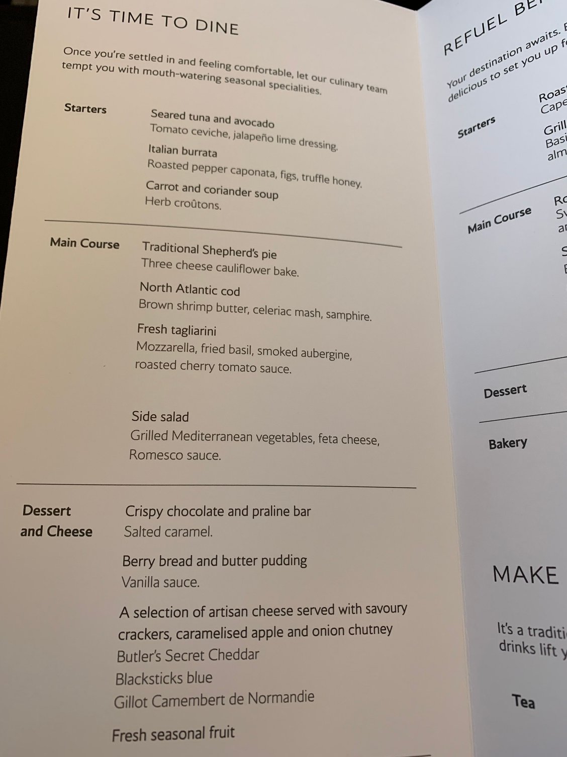 The menus have already been posted. We both had the Tuna and the Shepherds Pie which was absolutely delicious. I asked for the Worcestershire Sauce which made it even more aromatic. I had the cheese plate. My beloved was behind me in 3A so I have no idea what he had.