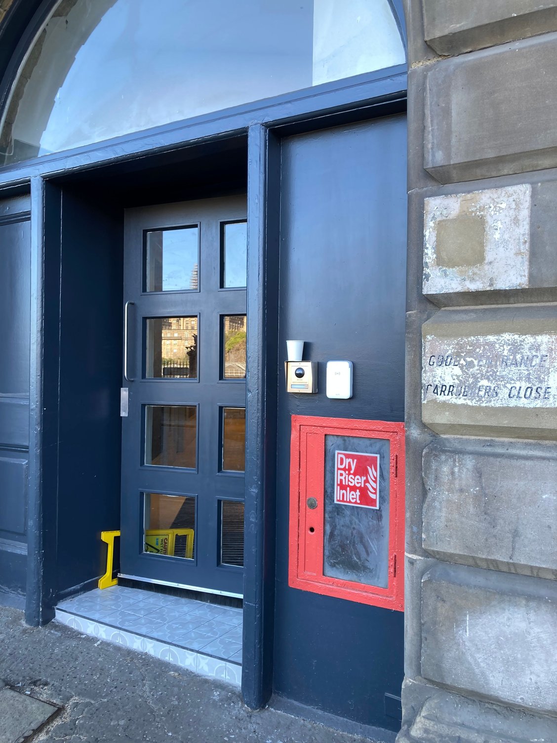 As in the photo above, the sign says Jeffery Street. And there IS a white intercom box. And the door is no longer white. Nice little entrance area, no access to anything but an elevator.