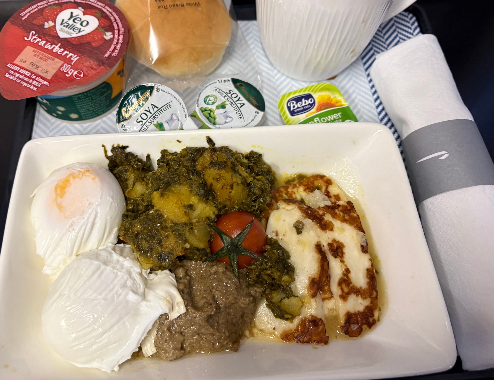 MOML breakfast (soya milk not part of the tray). And yes, runny yolks!