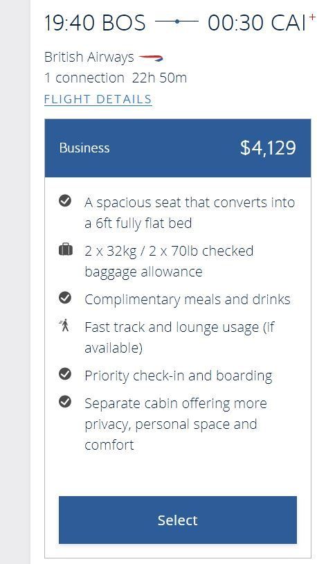 I did a dummy booking from BOS-CAI, picking an east coast departure at random. I chose all BA metal flights, and this is what comes back: